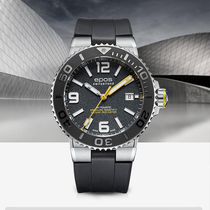 这款EPOS 爱宝时的潜水表,以黑色为主调,彰显沉稳大气的风范。