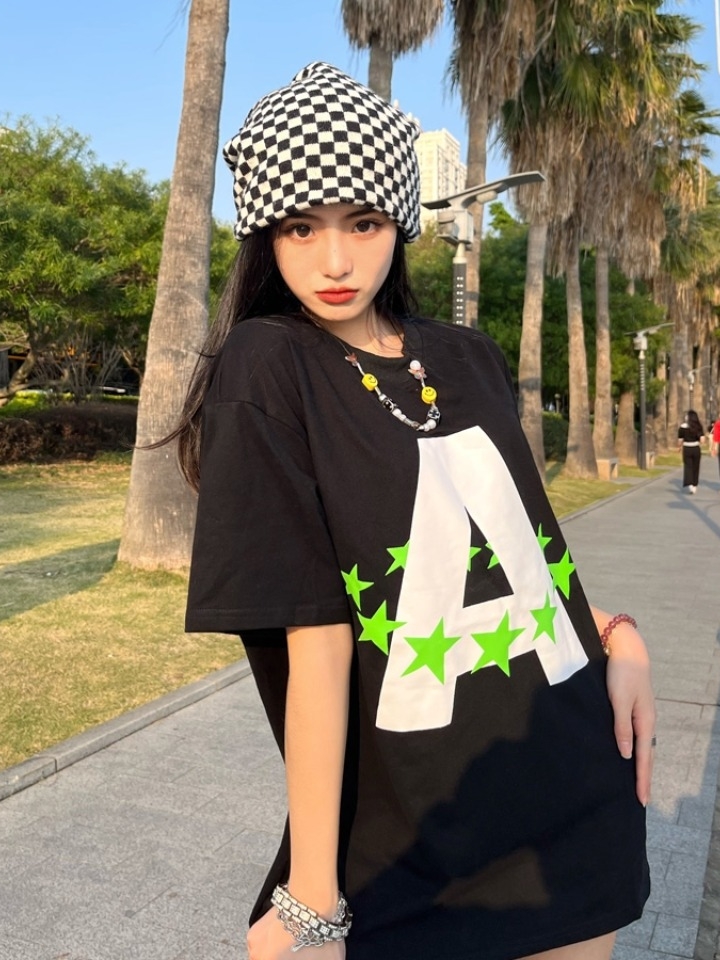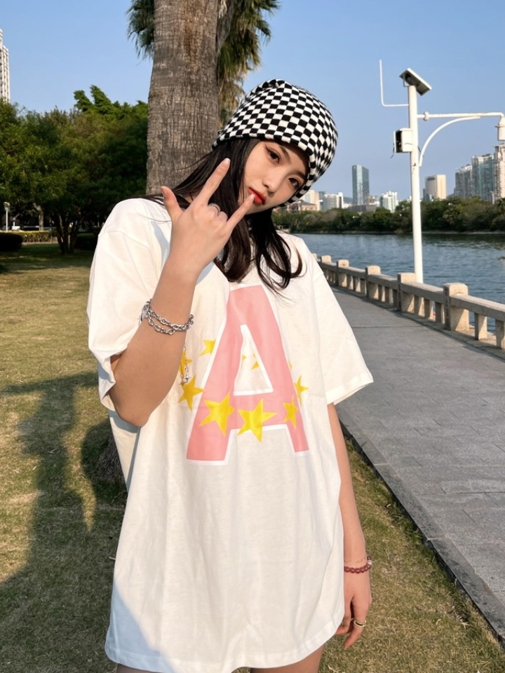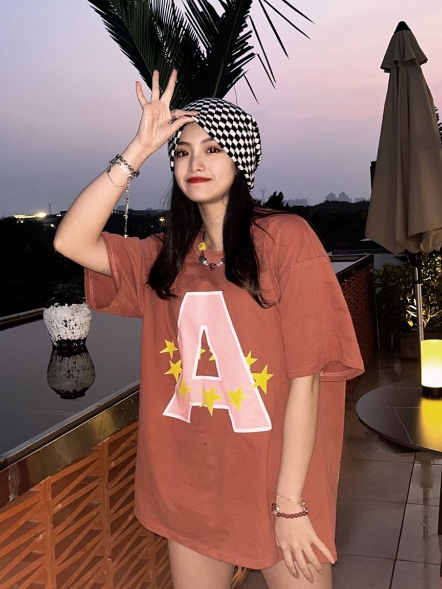 这款t恤是简约的风格,宽松的版型,时尚百搭,胸前的字母印花,很有个性,搭配牛仔裤或者短裤都很好看。