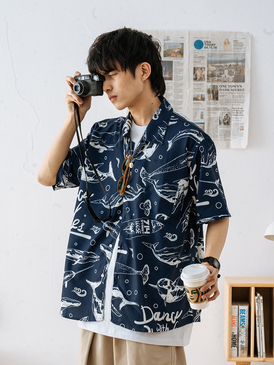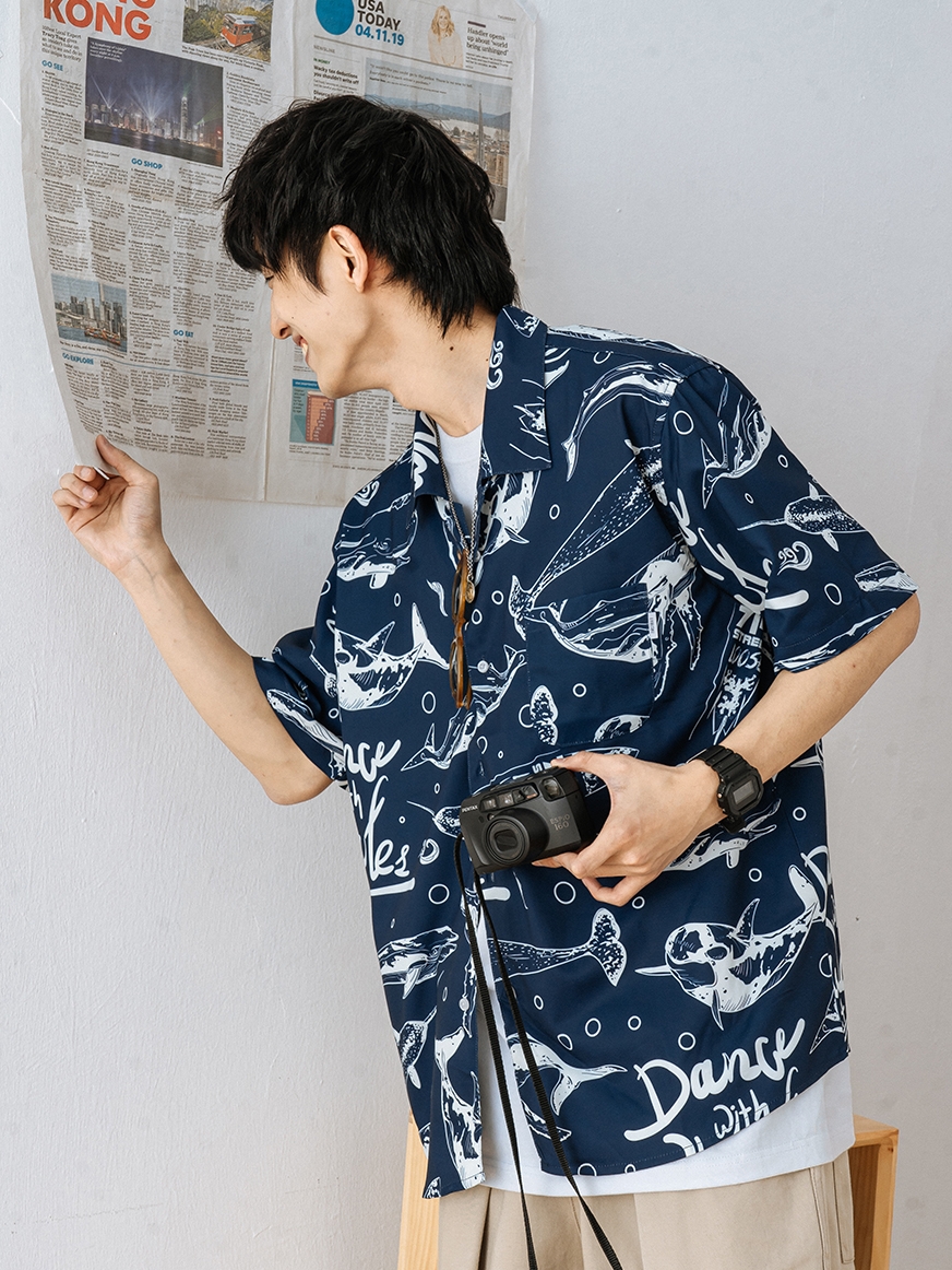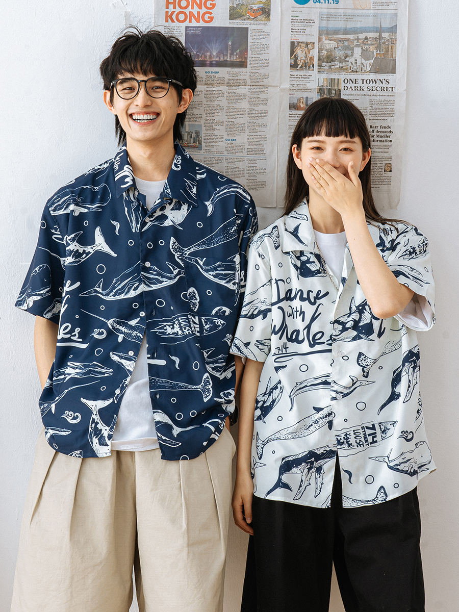 日系风的衬衫,手感丝滑亲肤,抗皱不易变形,垂感很好,手绘满印的鲸鱼图案个性满满,采用数码印花工艺,色牢度好。