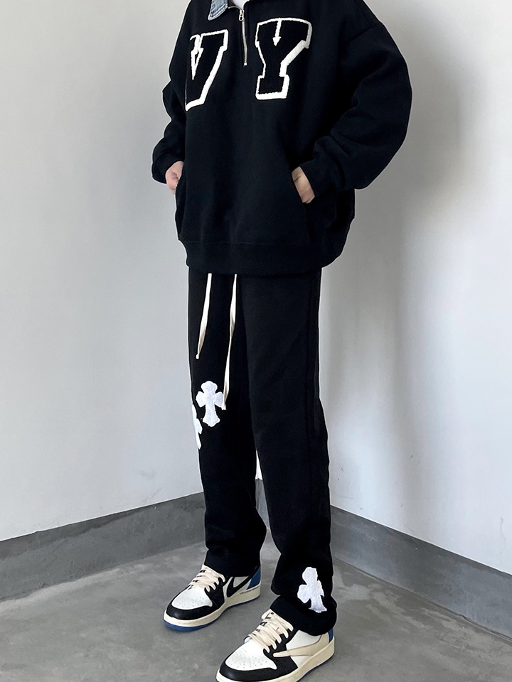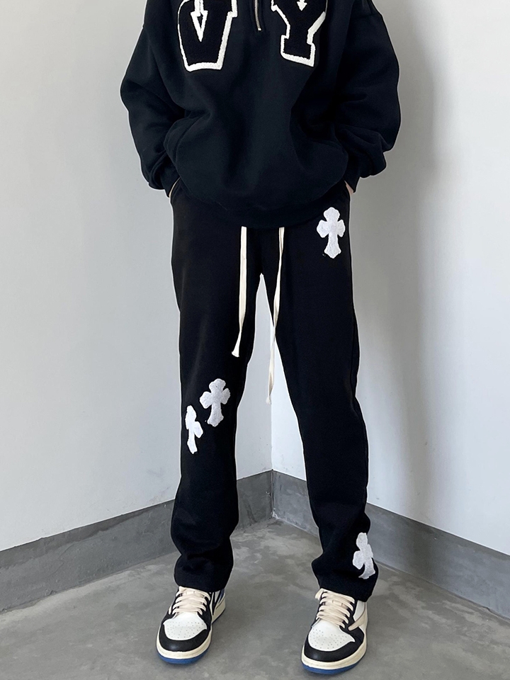 这款休闲裤的裤身有十字架绣点缀,显得与众不同,个性十足。直筒子楼的版型穿着也非常舒适自在,对身形的包容度高。