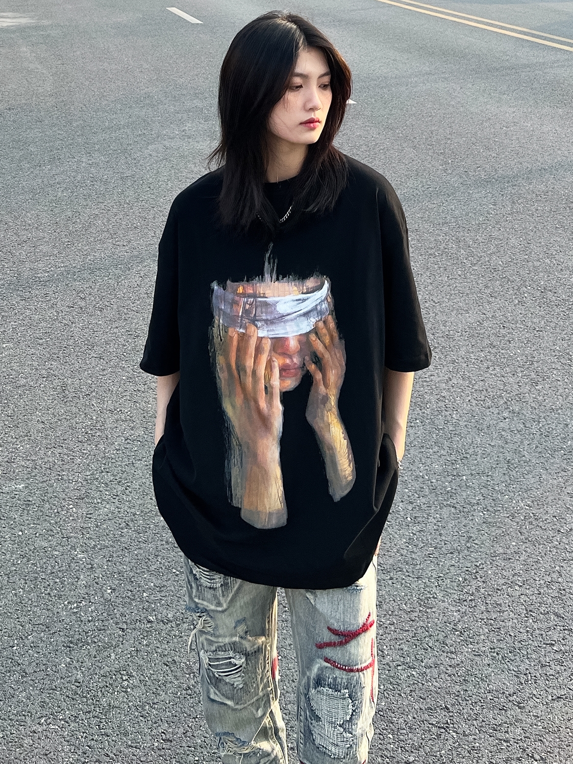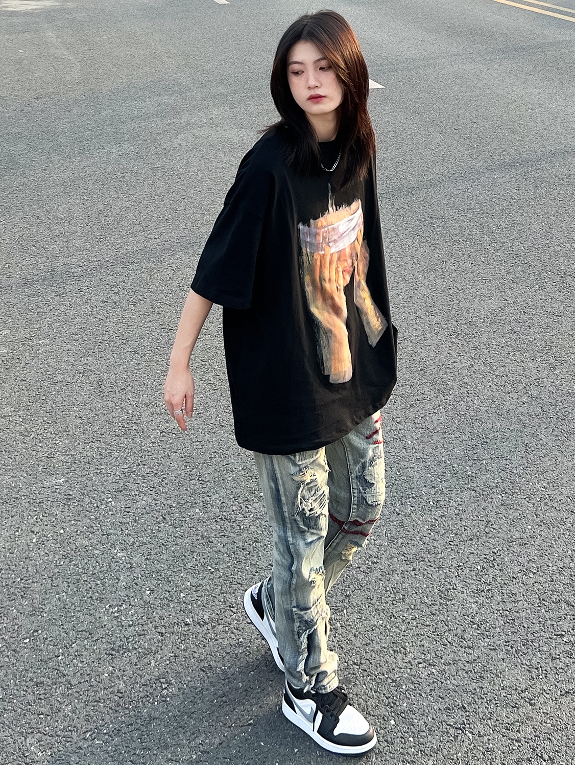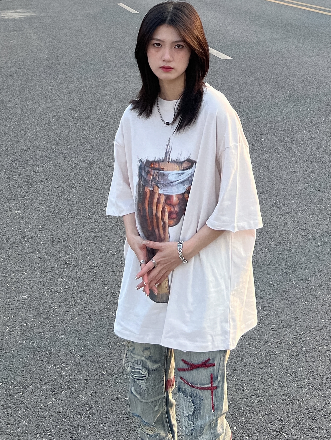 个性的街头风玩出叛逆的味道,经典电影中的小丑印花一方面向经典致敬,一方面也塑造出酷感,宽版型的设计加上落肩袖的造型,给人一种十足的嘻哈范。