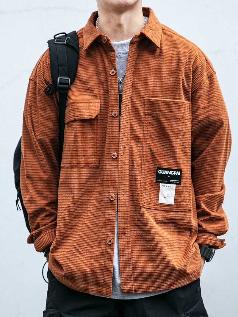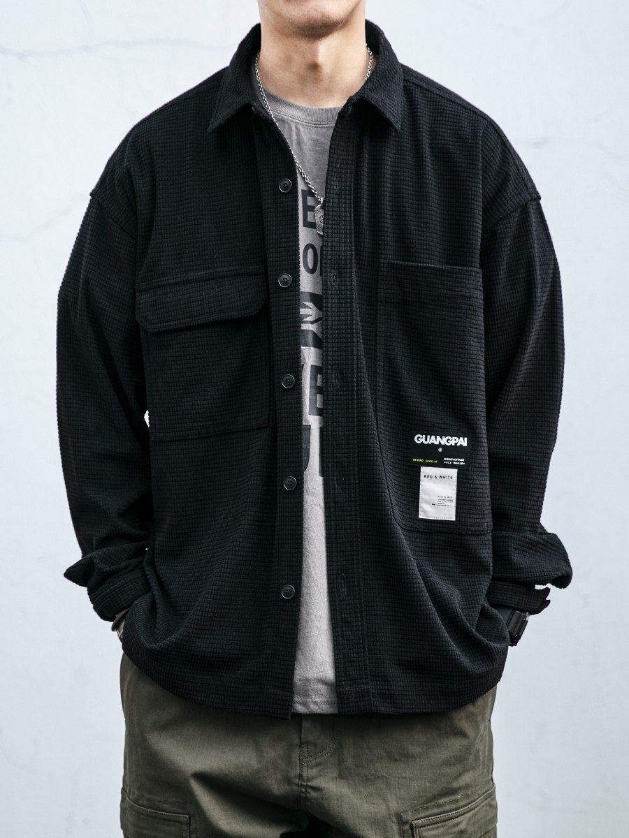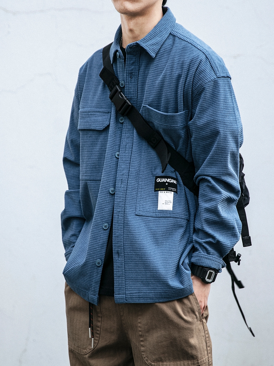 我发现胸前口袋采用了拼接线条,使得视觉效果更加丰富辅以华夫格图案为衬衫增添了亮点的同时,在加上排口也让我们穿着效果加了几分