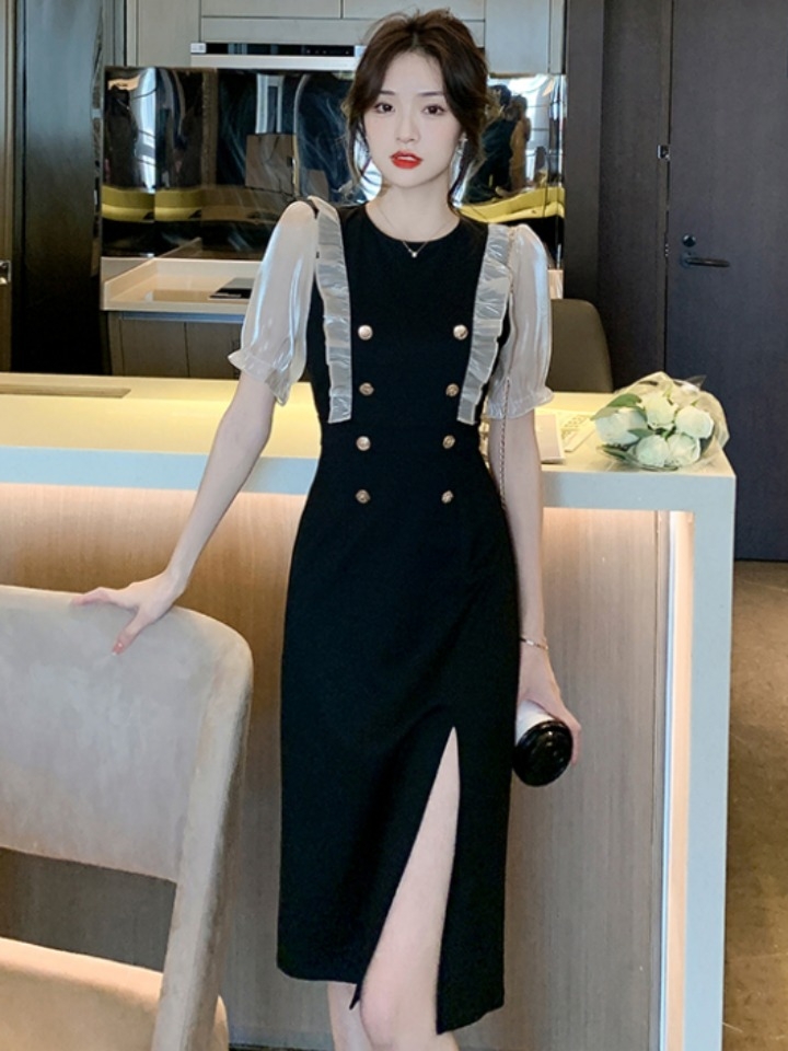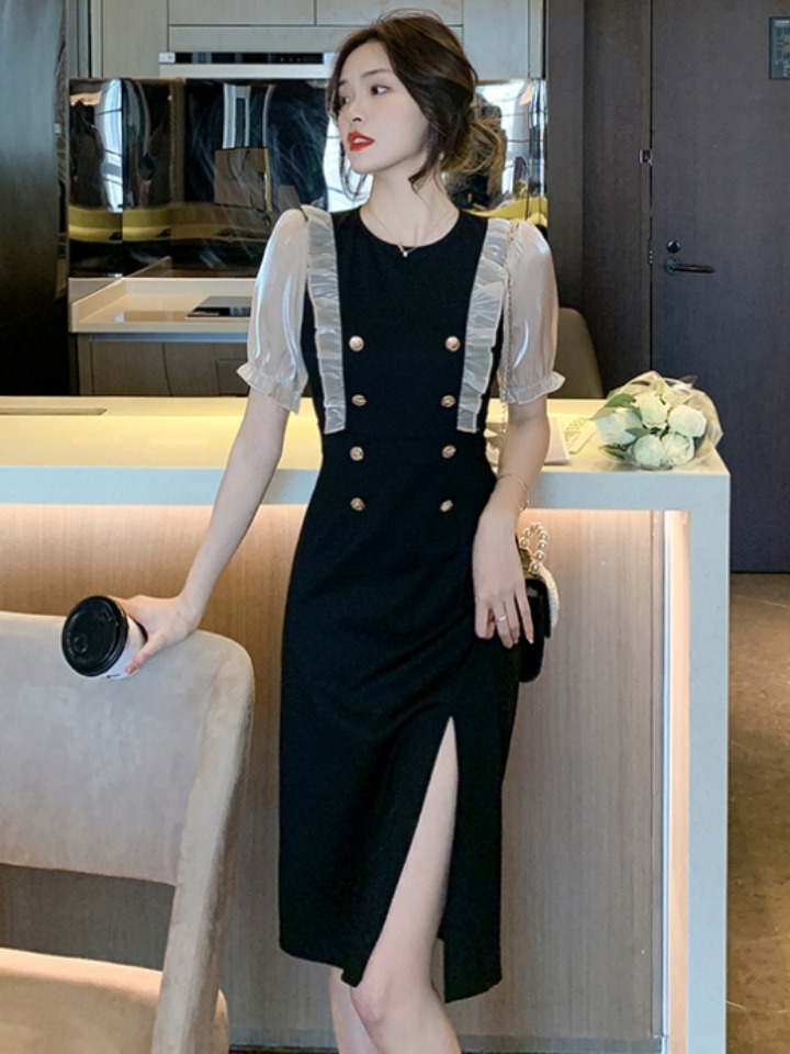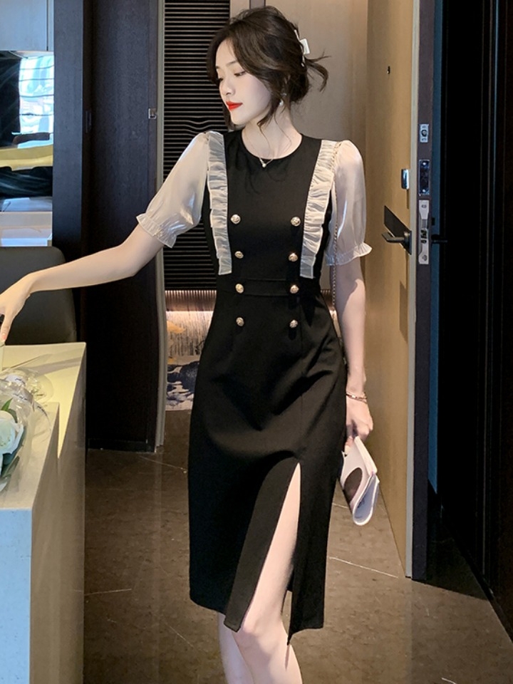 撞色的连衣长裙,给人一种圣洁的感觉,下摆的拼接荷叶边则是为整体注入了一丝淡淡的甜美气息,同时又融合了些微优雅。