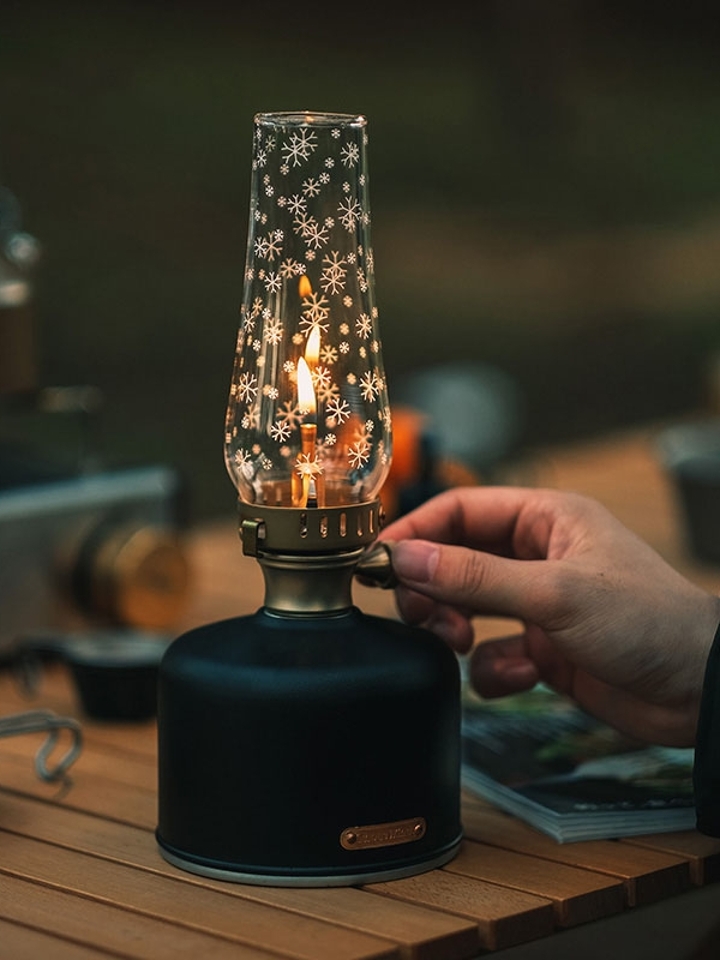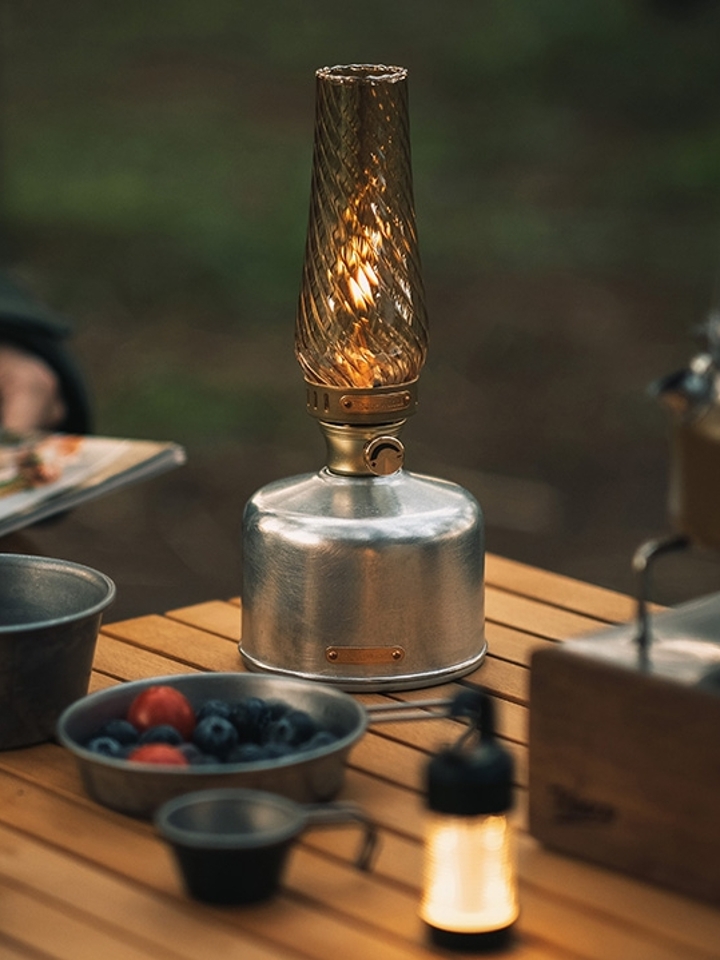 户外露营环境设计的照明营地灯平底座采用圆形瓶装结构设计,360度全方位无死角照明,独特的三防设计充电。
