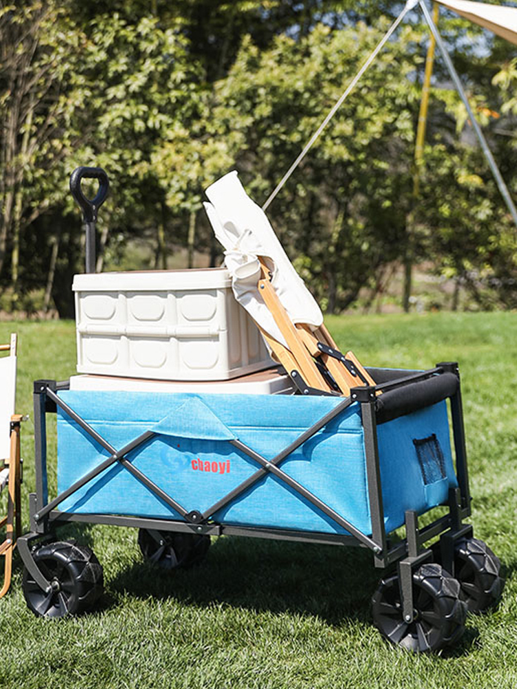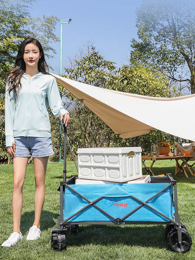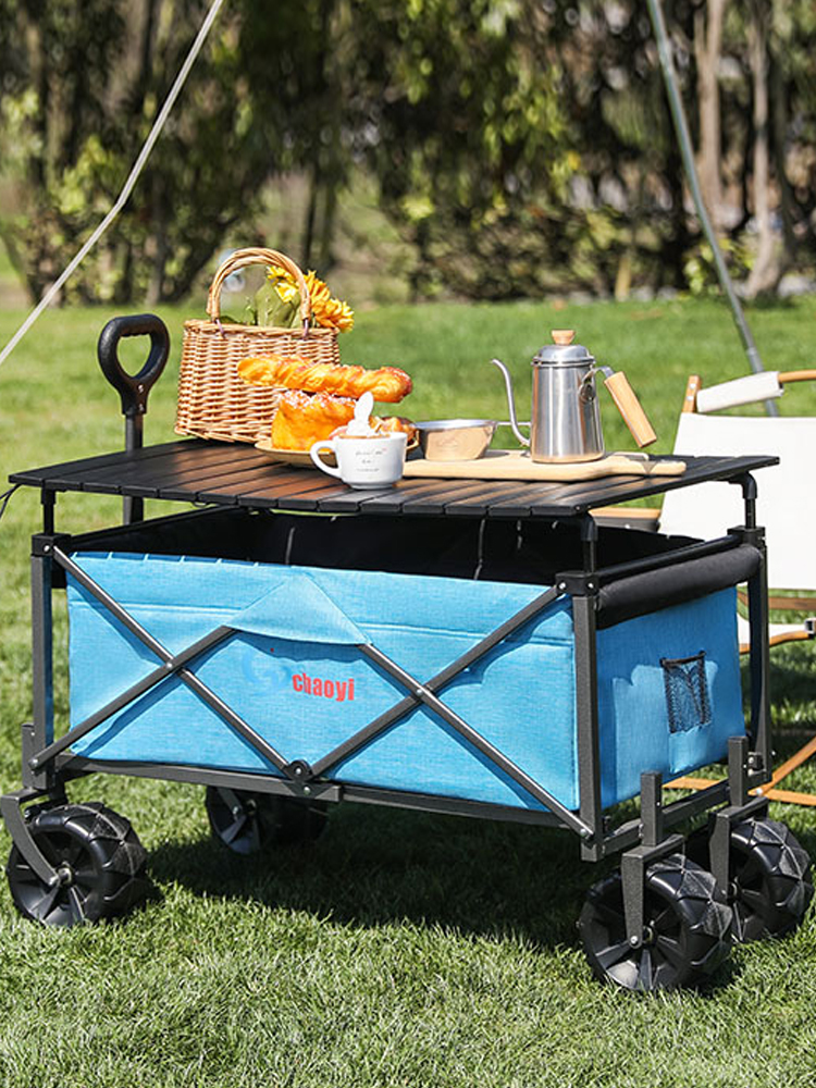 推车的上面有折叠板设计,可以作为露营的桌子使用,十分的实用。车子采用四个轮子设计,更加的平稳。