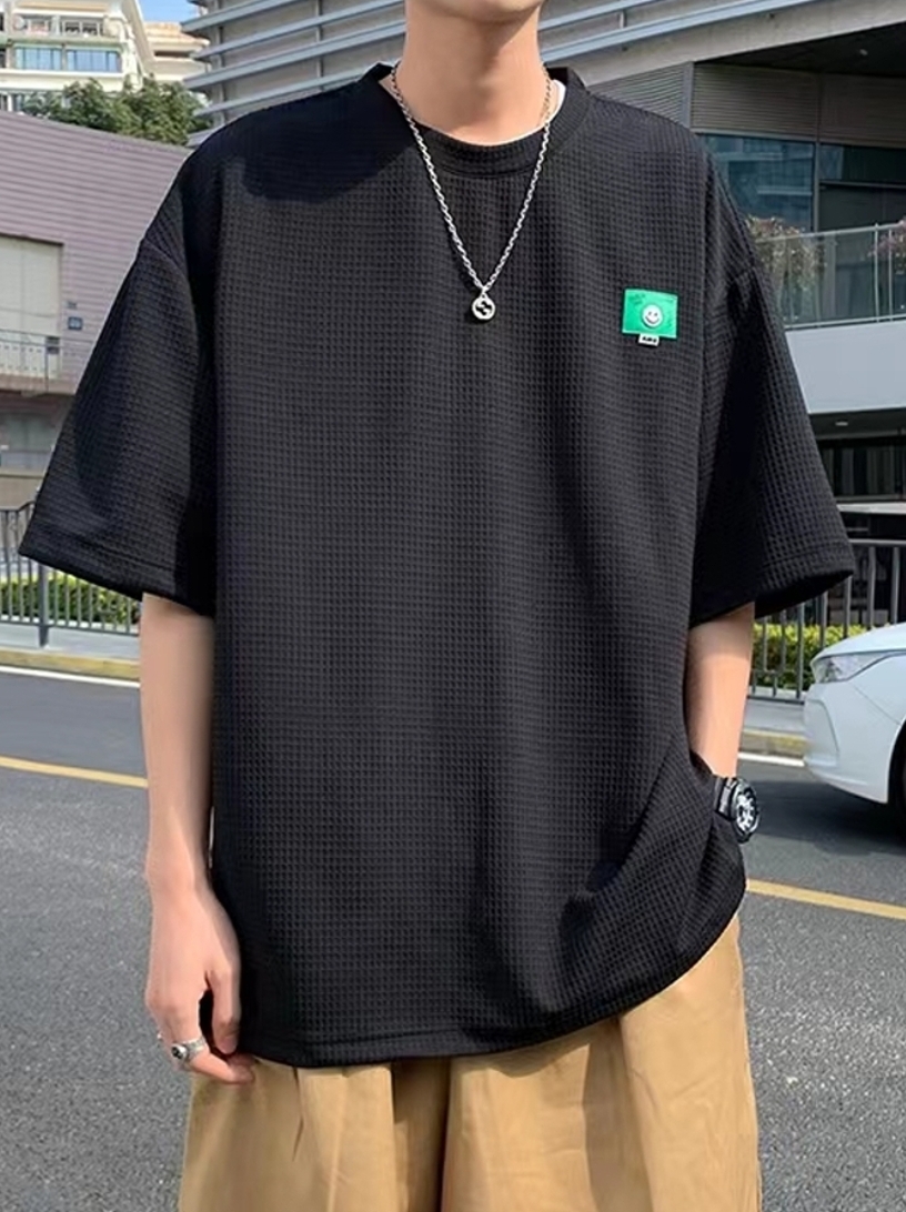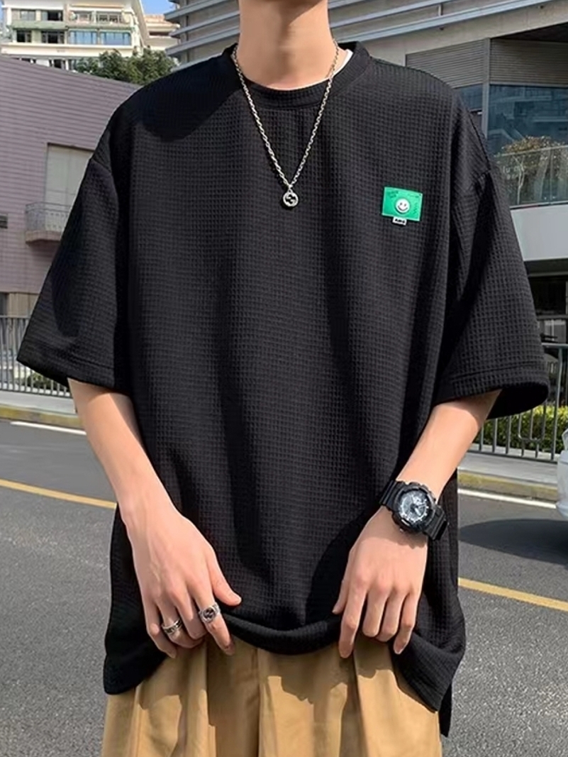 这款T恤采用了复古华夫格面料,具有良好的吸湿透气性,面料本身若暗若明的布面隐格所呈现出的特殊纹理质感,提升了整体的视觉效果。