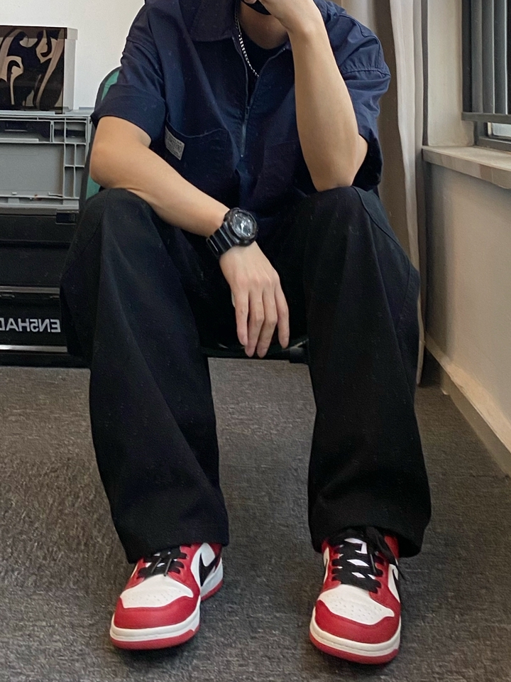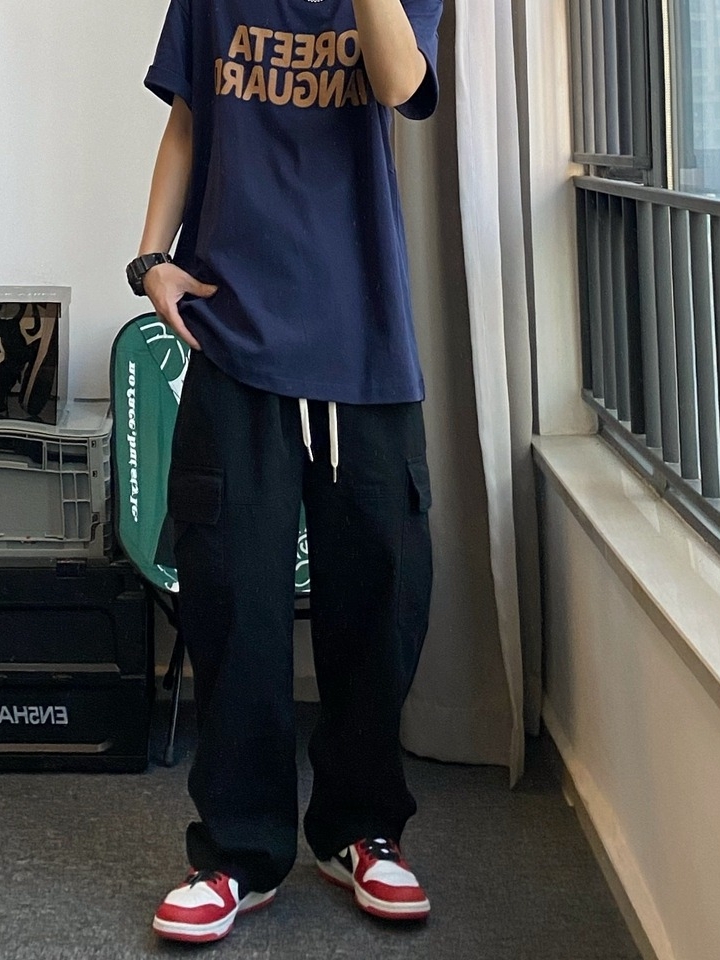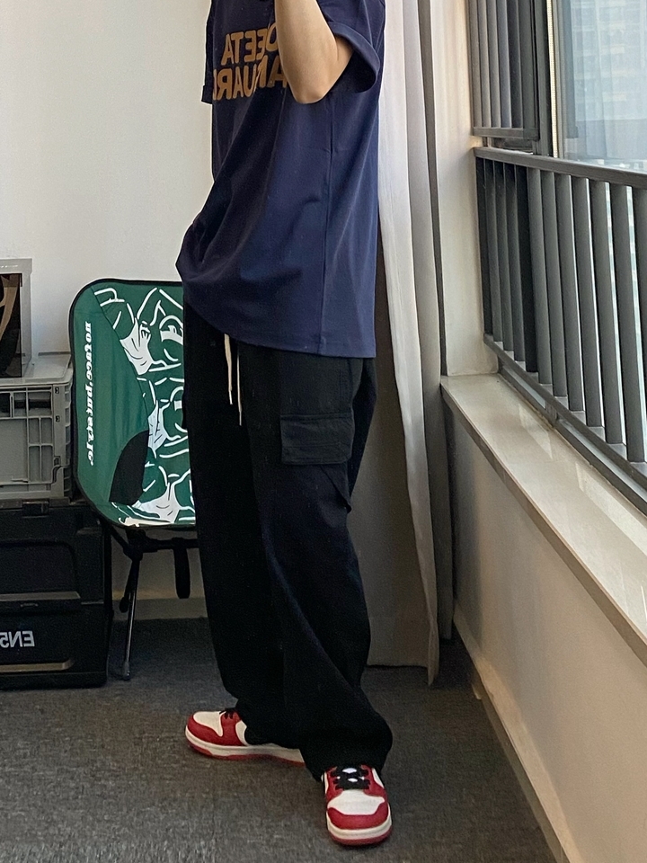 这个裤子就是那种宽松但是很有型的裤子,颜色也是非常经典百搭的黑色,穿在身上就非常的百搭而且穿上就很日系。