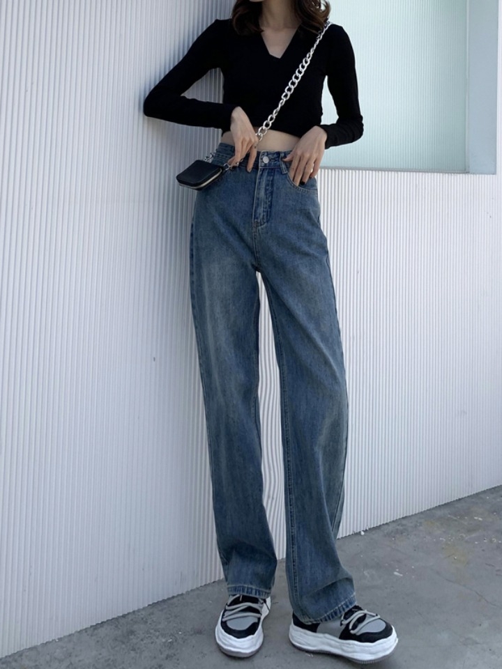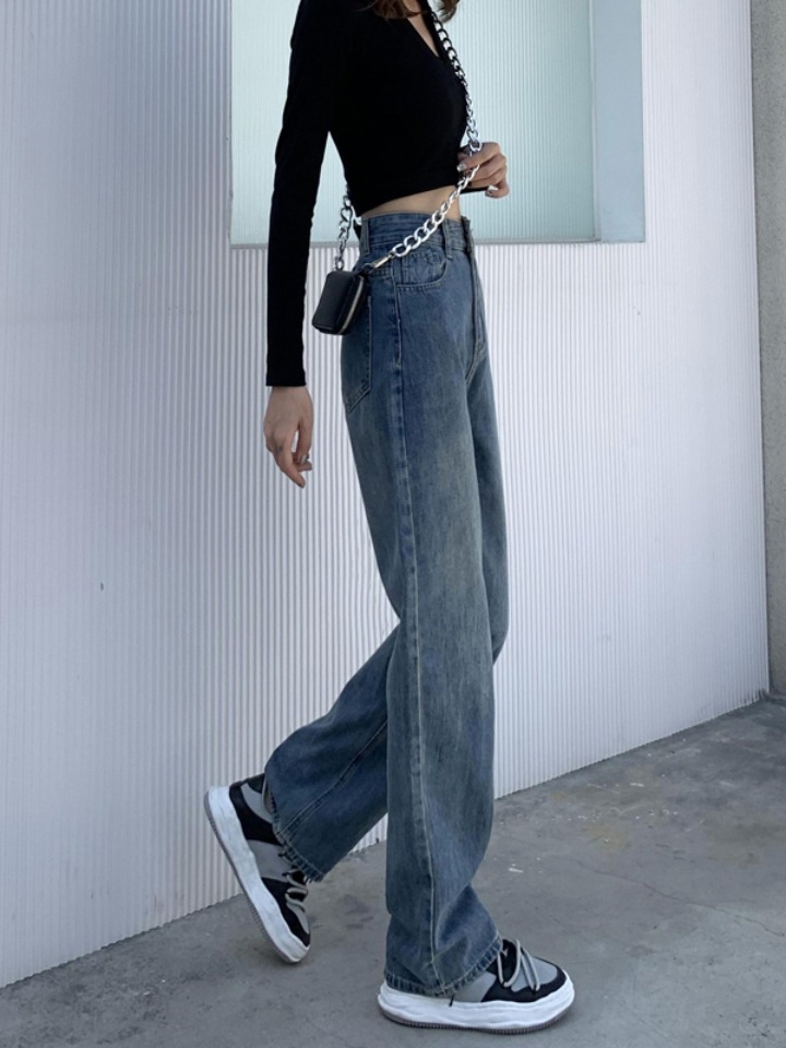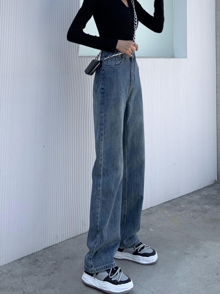 简约大方的牛仔面料的裤子,带有时尚的复古风格,高腰款式彰显时尚美腿,牛仔面料带有工装质感复古做旧,搭配运动鞋,整体风格极具街头潮范。