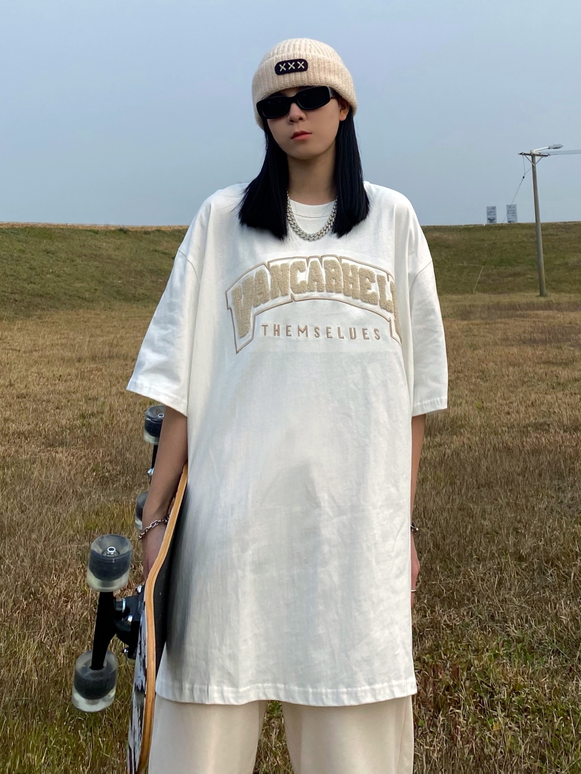 立体刺绣哇,木有一点瑕疵,衣服是宽松版型,下摆两侧开叉,纯棉质感,长度大概到屁屁这里,对的,就是宽松版型哦。