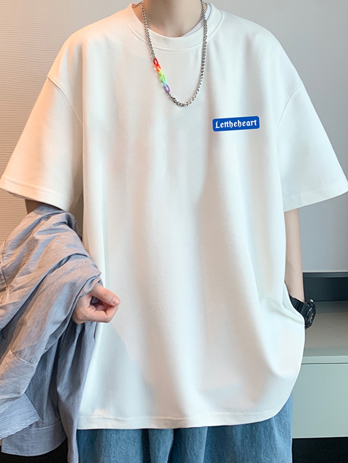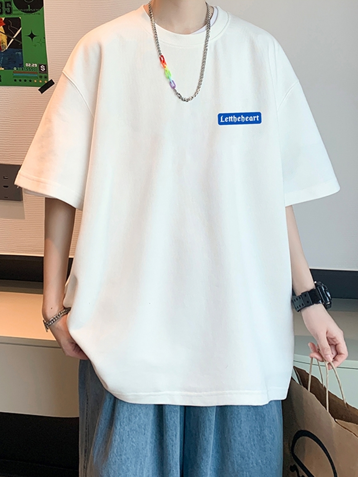 这款t恤是简约的风格,宽松的版型,时尚百搭,胸前的字母印花,很有个性,搭配牛仔裤或者短裤都很好看。