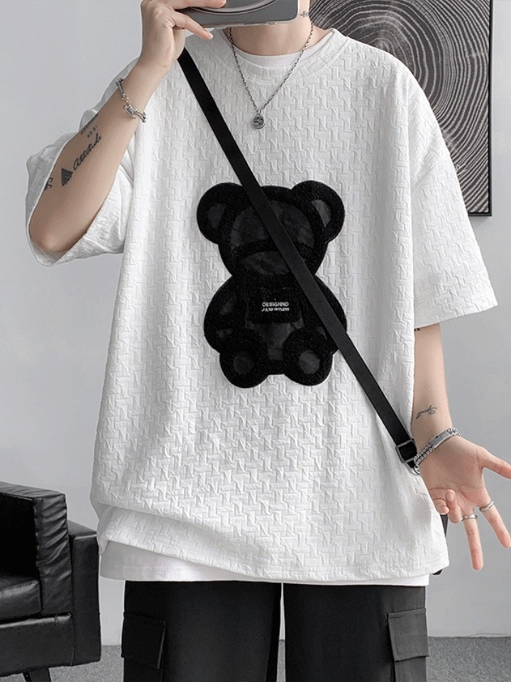 本款短袖T恤选用柔软透气的面料织造,合身剪裁,穿着舒适不束缚,活力自如!衣身胸前趣味小熊图案印花,带来青春活力气息。