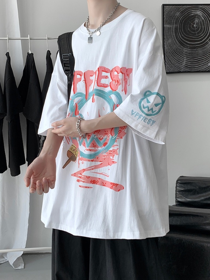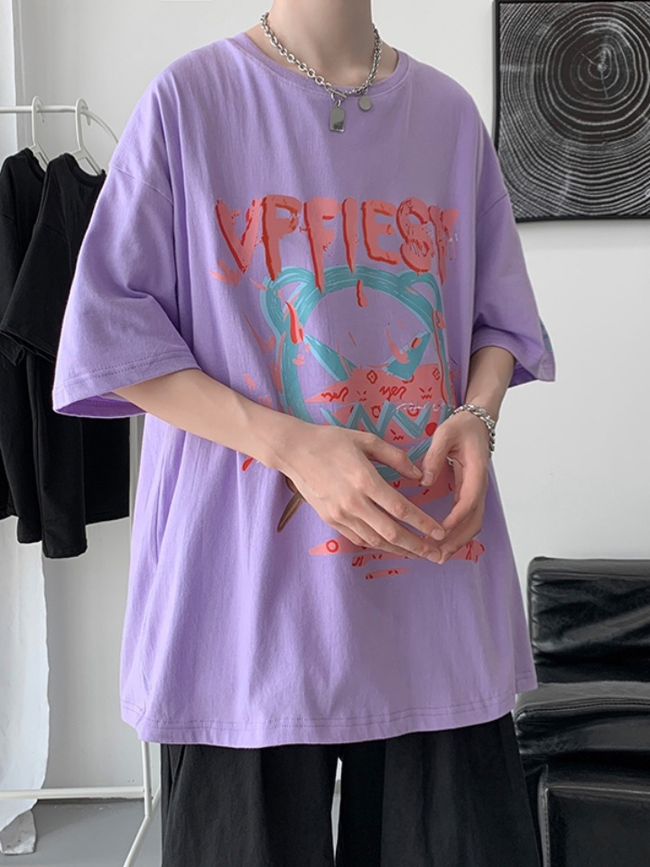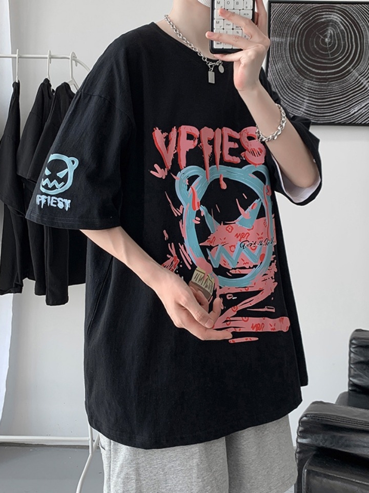 纯棉布料打造,以经典圆领凸显其内敛大方的特点,胸前设计师原创的恶魔图案为整体增添霸气不羁,简单休闲,且做工精细,