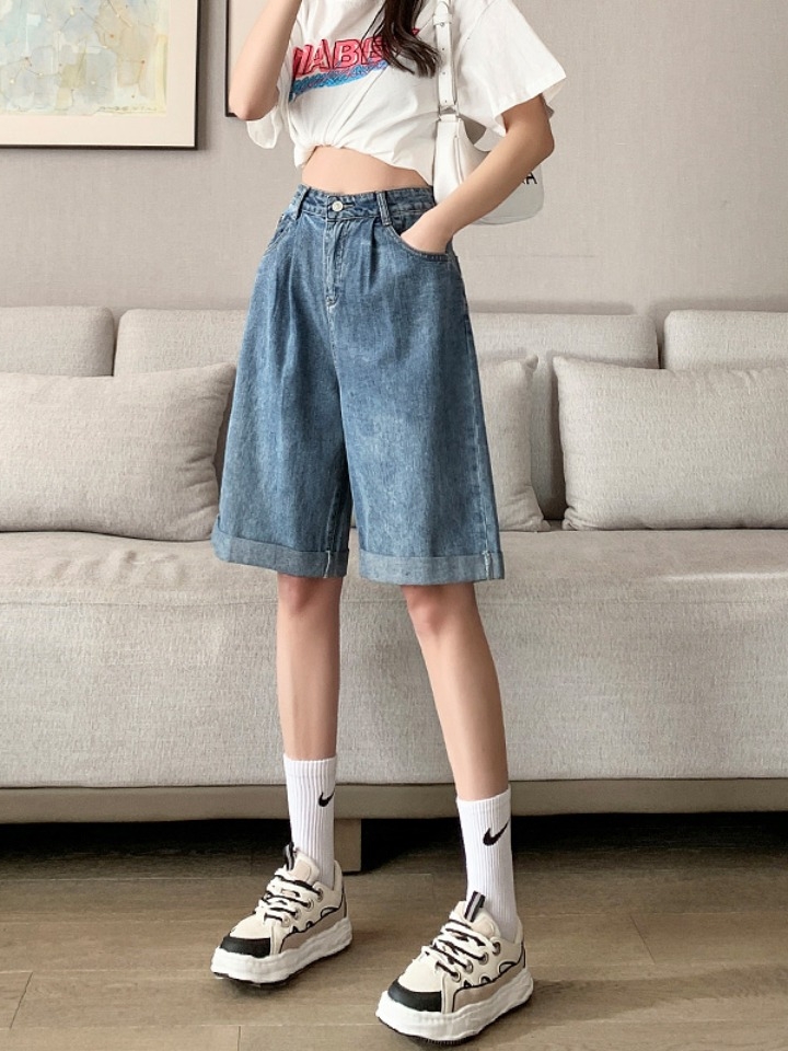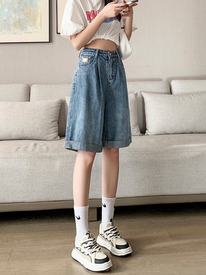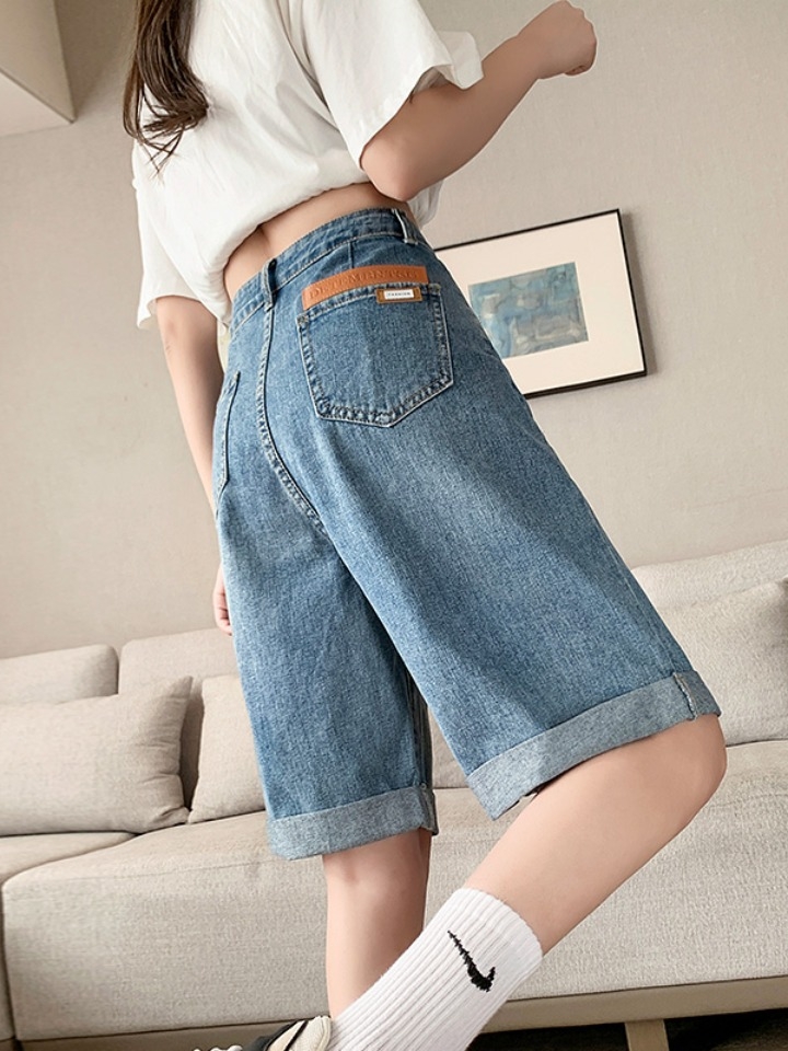 复古百搭的一款牛仔短裤,长度接近五分,裤脚挽起来一圈更好看,不是单薄的那种牛仔,用料足,版型和质量都很好。