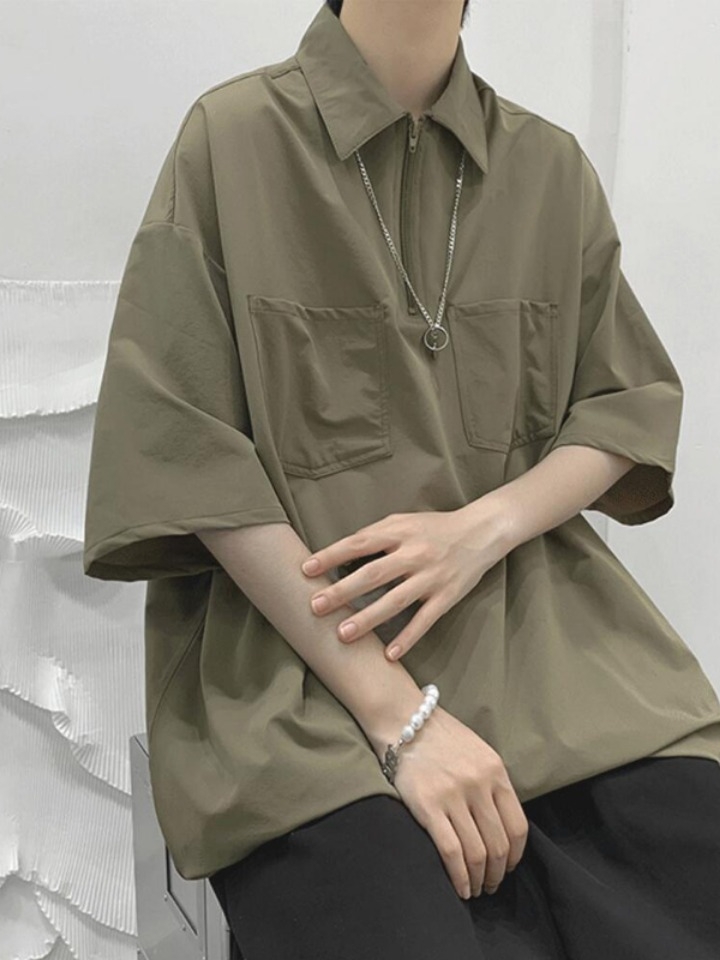 很休闲风格的T恤,polo式的小翻领领型,上身很显气质;利落的落肩五分袖设计,再搭配宽松的衣身版型,上身真的很显瘦,也很简约大方