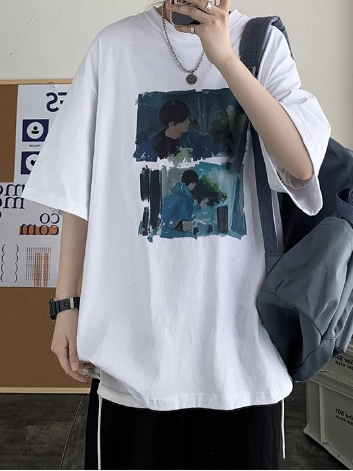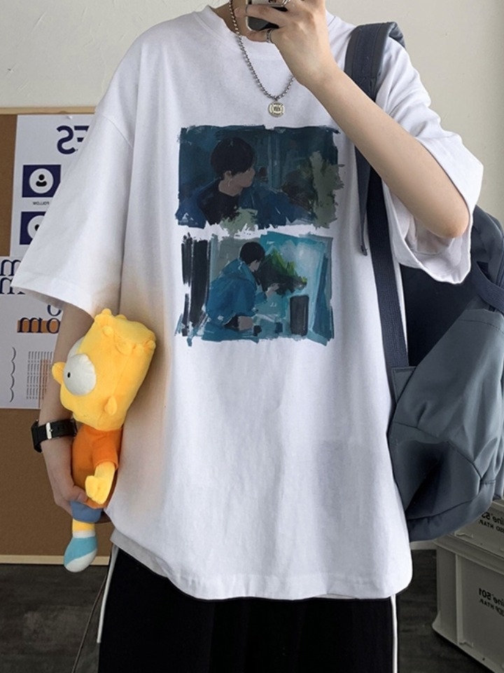 艺术感十足的欧美油画印花,颇有大匠风范,无论是色彩还是细节都处理的恰到好处;宽松落肩版型设计,BF风十足