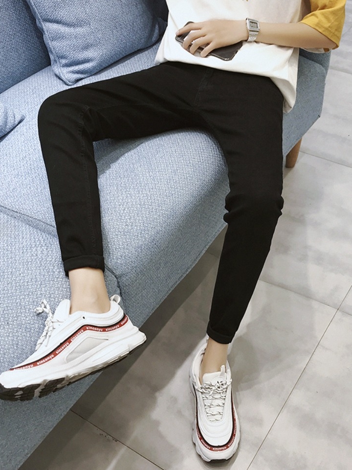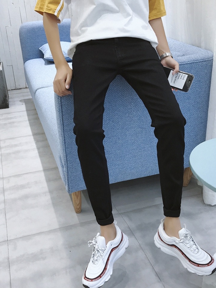 一款炒鸡修饰男士腿部线条的牛仔裤,经典的纯黑色低调又大气,直筒的裤型搭配利落的九分长度,衬托笔直的长腿。