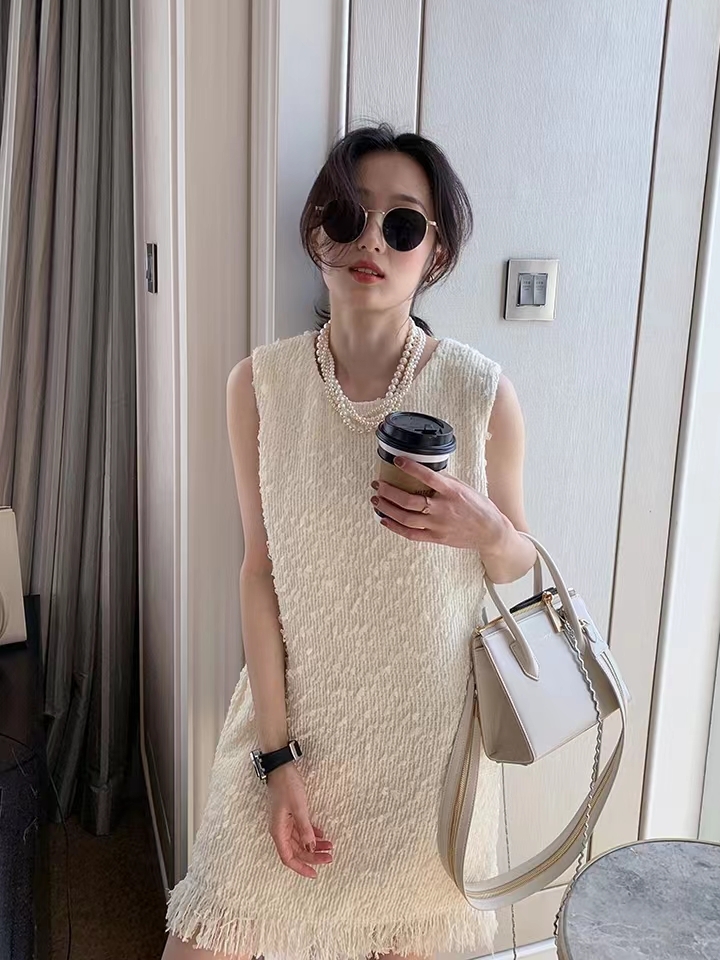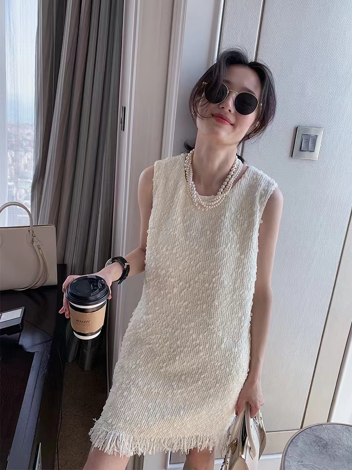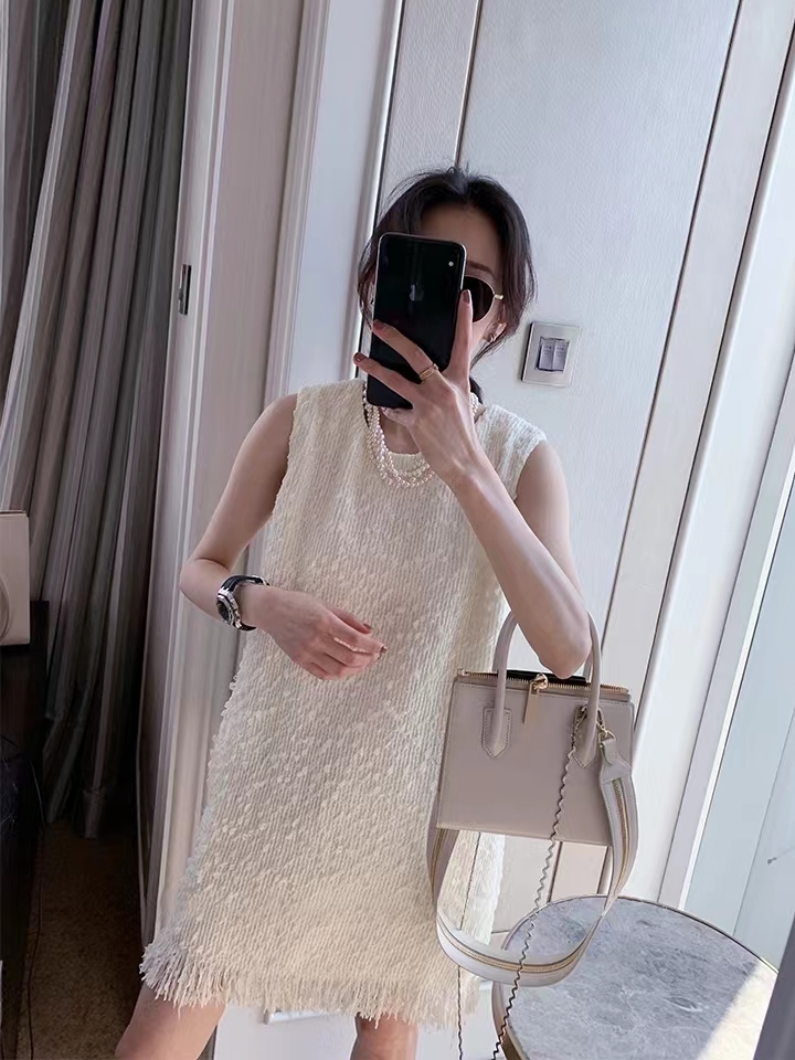 裙摆的流苏装饰打破了单调的裙身,在行走之间很有灵动感,白色的色调看上去就很是清新,很是减龄的一款连衣裙。