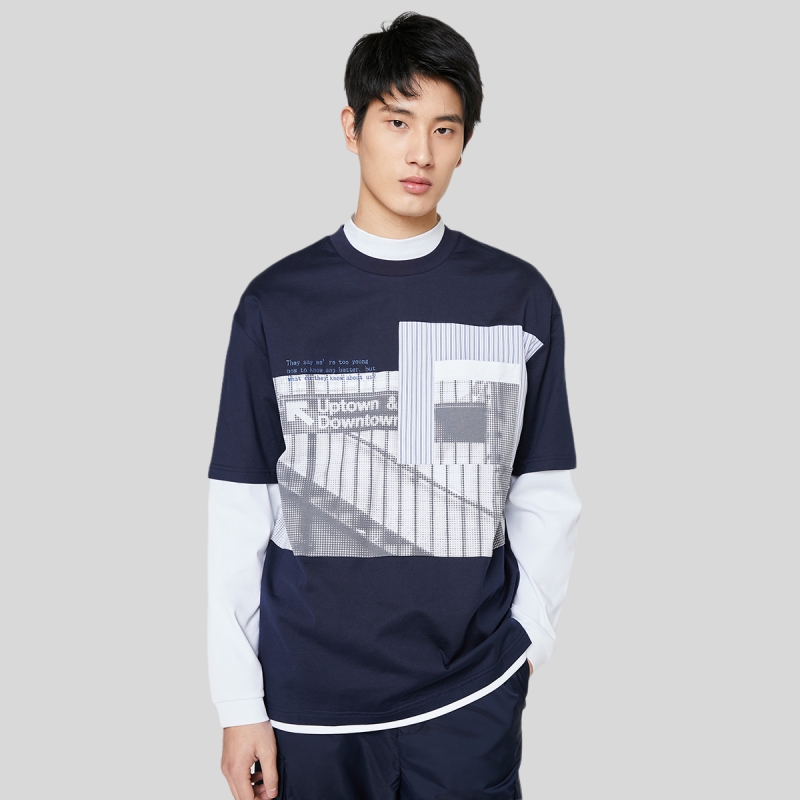 时尚的圆领设计,修饰颈部线条,凸显男士的干练气质,衣身撞色拼接设计,丰富视觉效果,宽松的版型,穿着舒适自在,休闲百搭。
