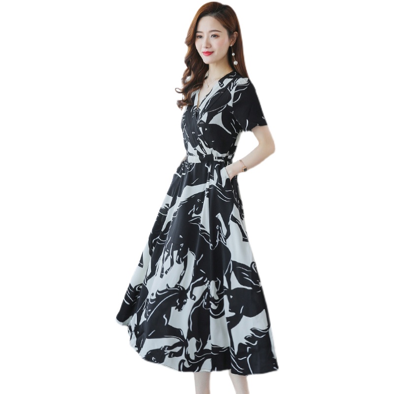 真丝面料,穿着舒适透气,印花图案,彰显时尚个性,中长款连衣裙,修身显瘦。