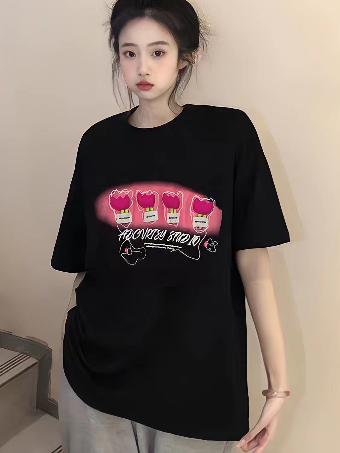采用经典的小圆领,适合各种脸型,胸前得花朵印花设计,为整体增添了几分时尚感,使得衣服不会过于单调。