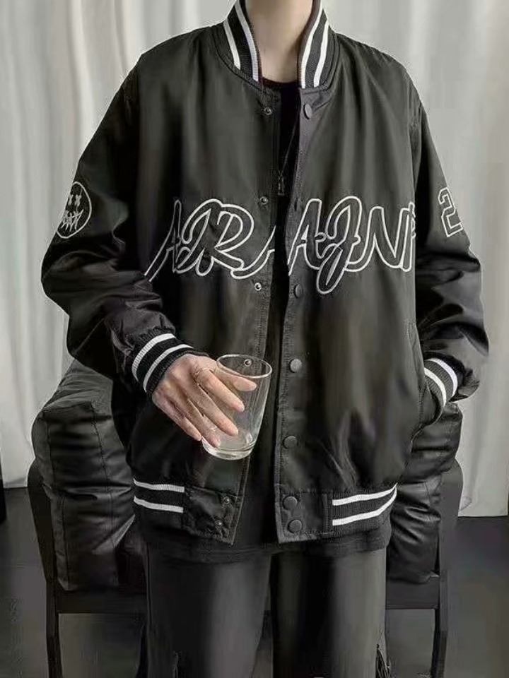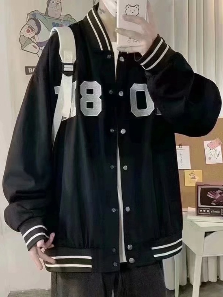 帅气的棒球服短外套,精细的花色刺绣。整体干练大方,舒适自然。顺带说一句,情侣装搭配中男方为辅是惯例。