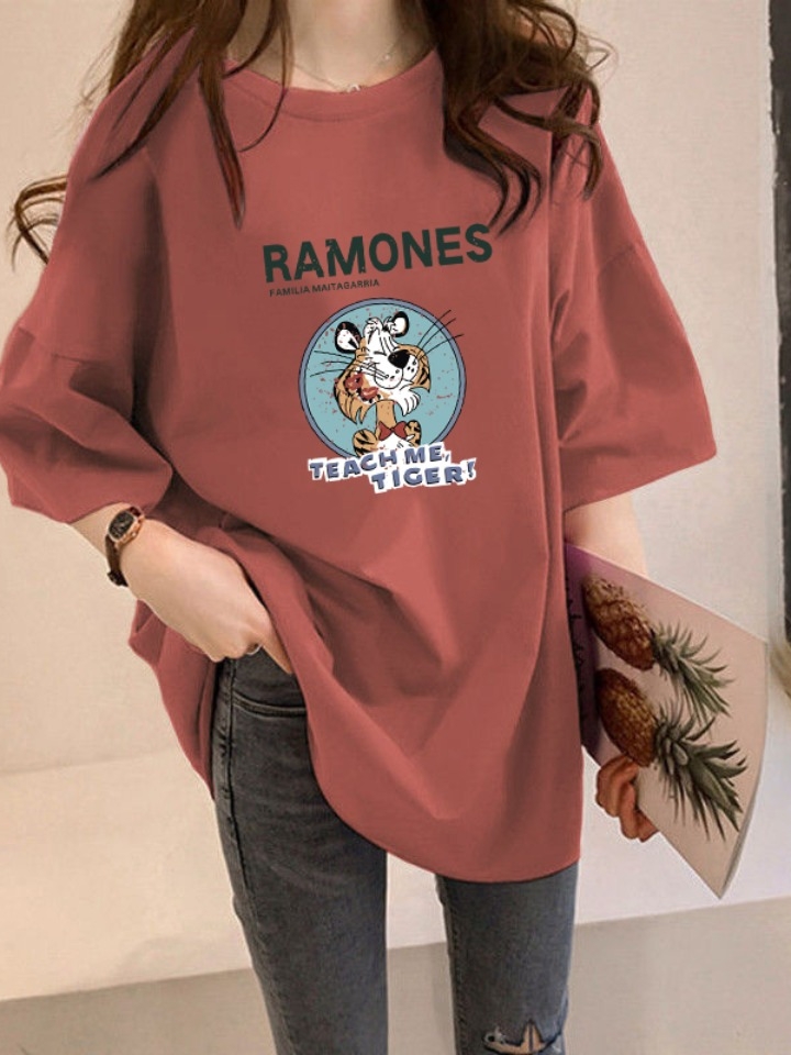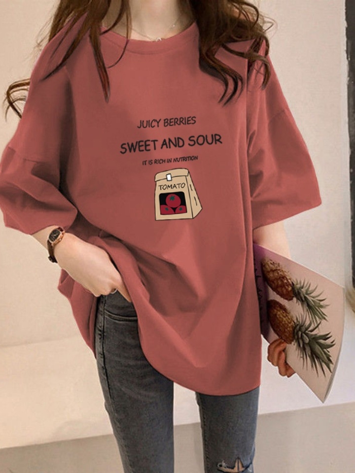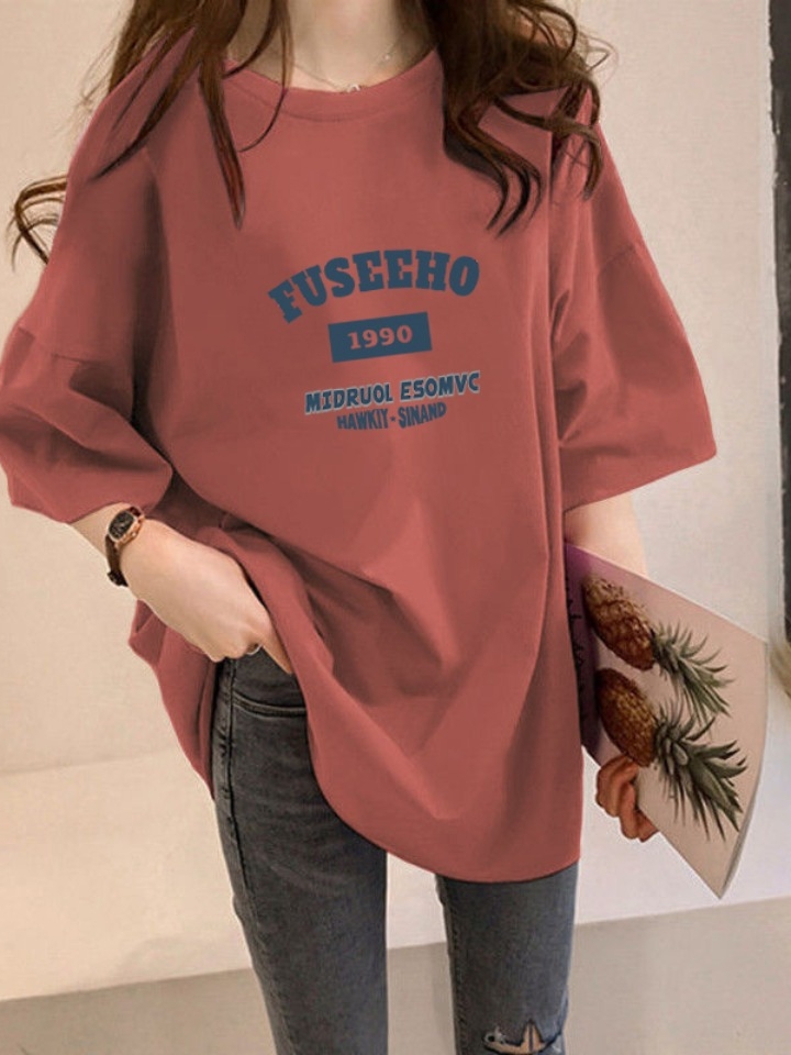 落肩袖型,营造慵懒惬意,胸前字母印花图案,增添时尚感,中长款的版型,搭配一条小脚裤,就可以啦。