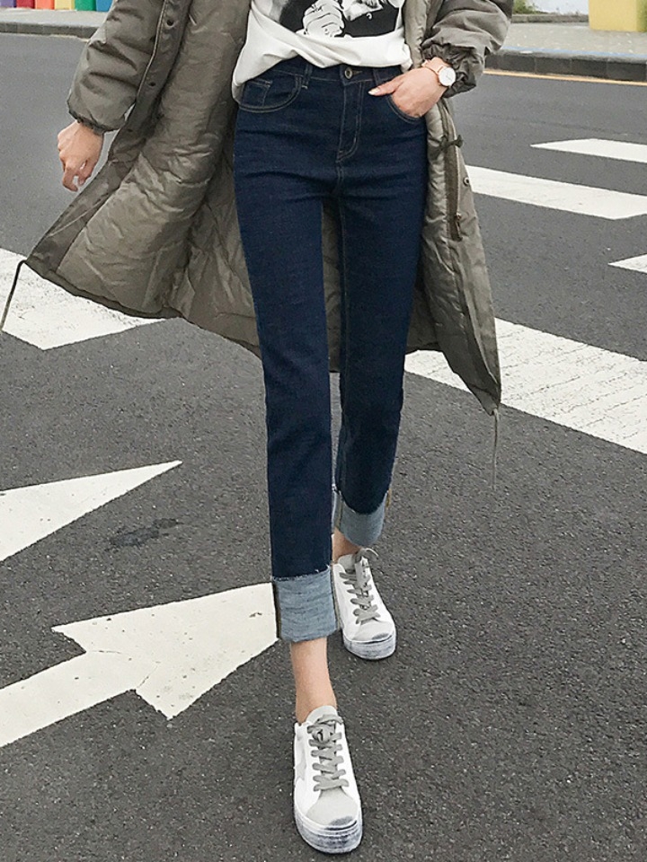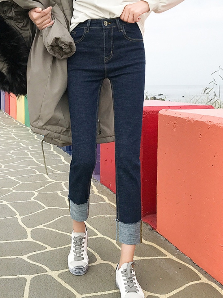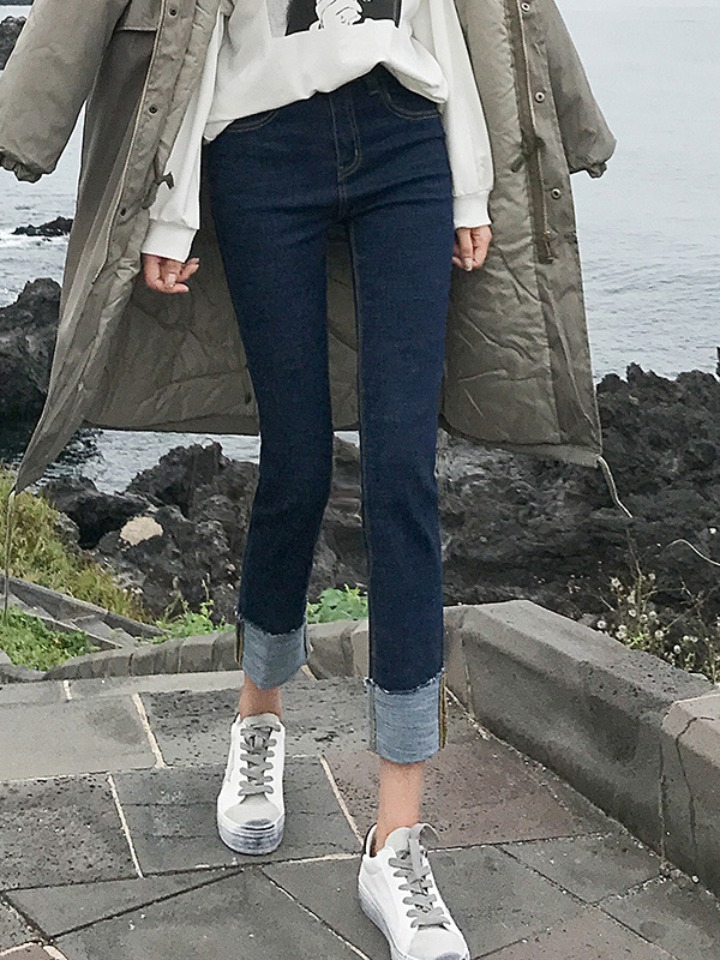 小高腰使上身有显胸下全是腿的即视感,直筒版型更是O型腿的福音,翻边裤脚效果很显个性,随意搭配纯色上衣都帅气洒脱。
