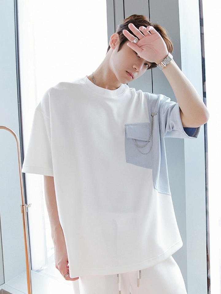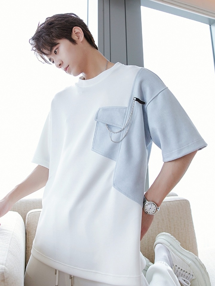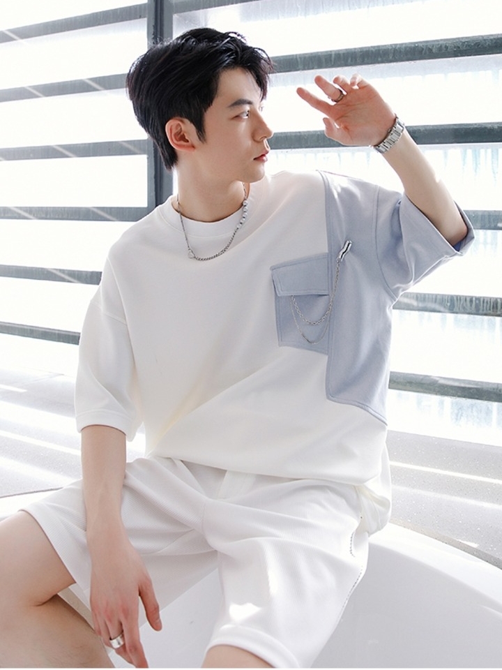 很有创意的一款T恤,链条口袋的个性装饰,搭配上一条白色短裤,整体看起来前卫具有潮范儿,随意的版型完全不挑人。