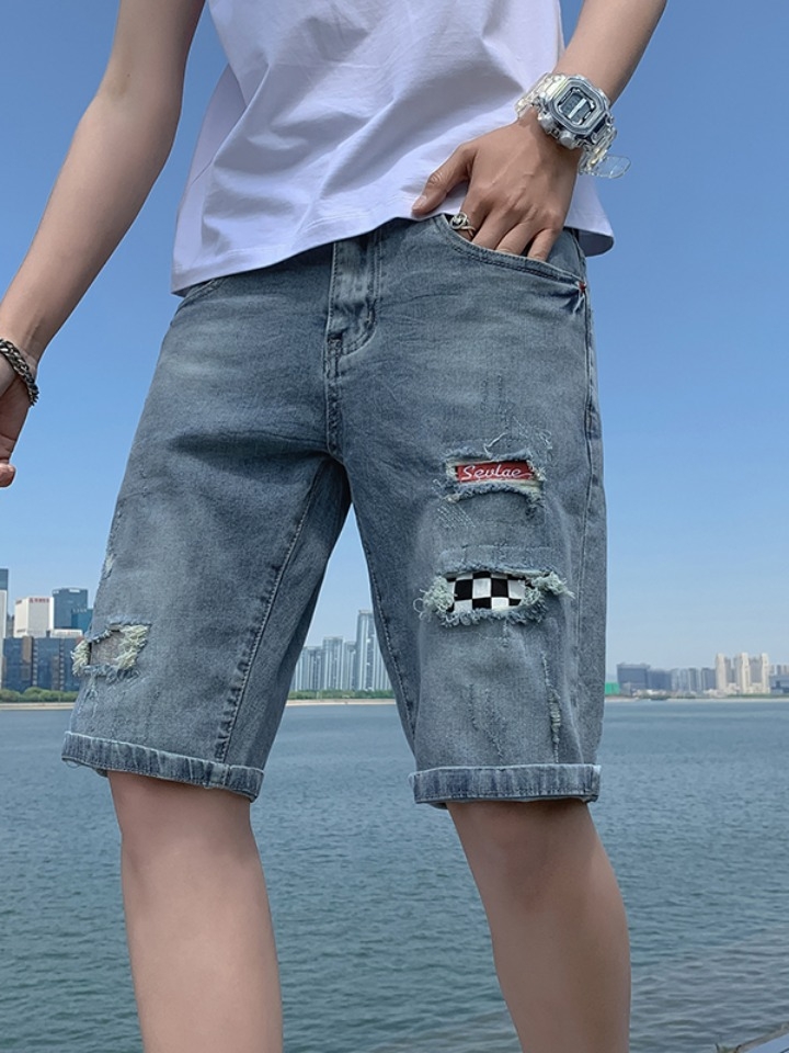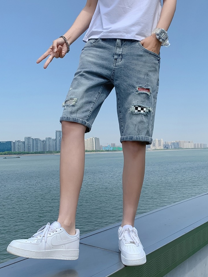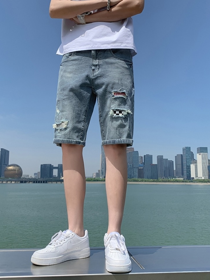 简约好穿的五分休闲短裤,破洞的牛仔短裤,裤子的口袋点缀,利落又好穿。