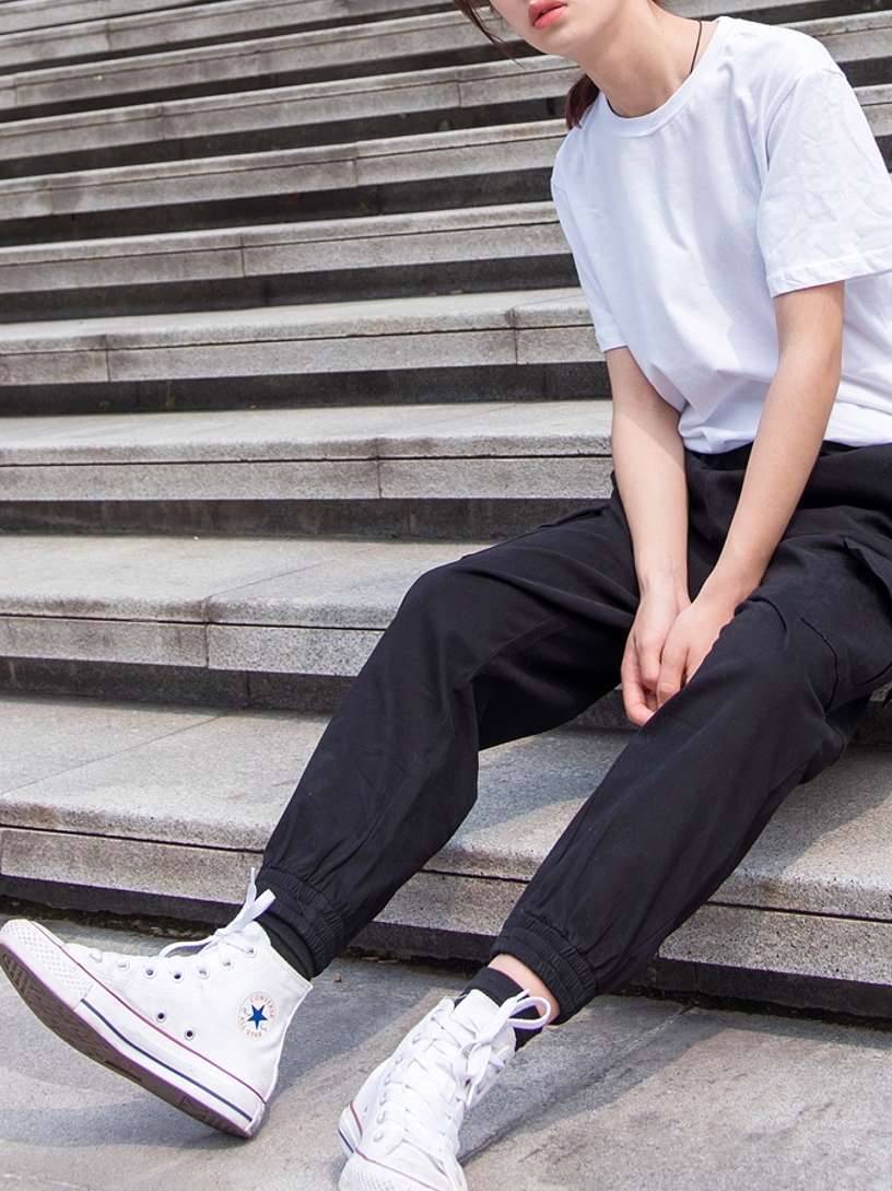 一款设计感十足的工装裤,裤身的口袋设计,不仅起到了装饰性的作用,还能放置自己的贴身小物品,而束脚版型特殊又个性。