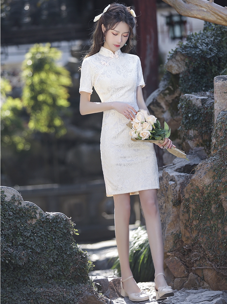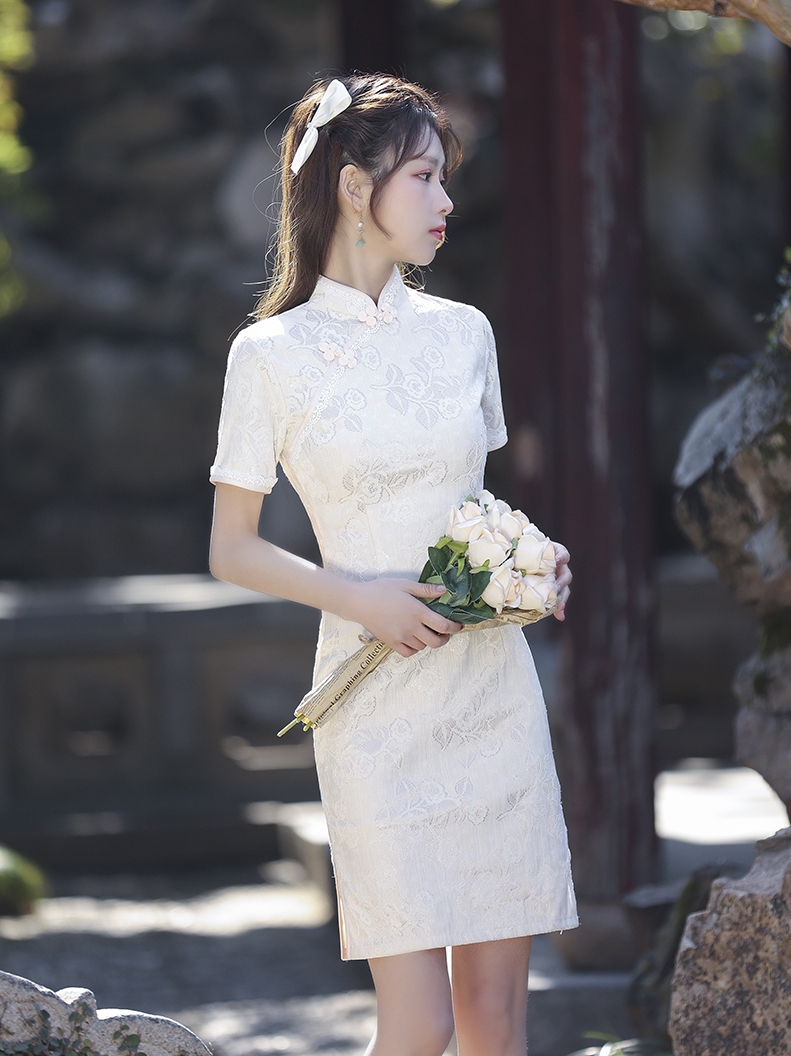 中式复古立领,经典传统斜襟盘扣,短款修身显瘦版型,加上性感又不失优雅的短开叉设计,使这款面料自带提花的复合蕾丝旗袍,穿在身上满载新潮时尚古风气息。