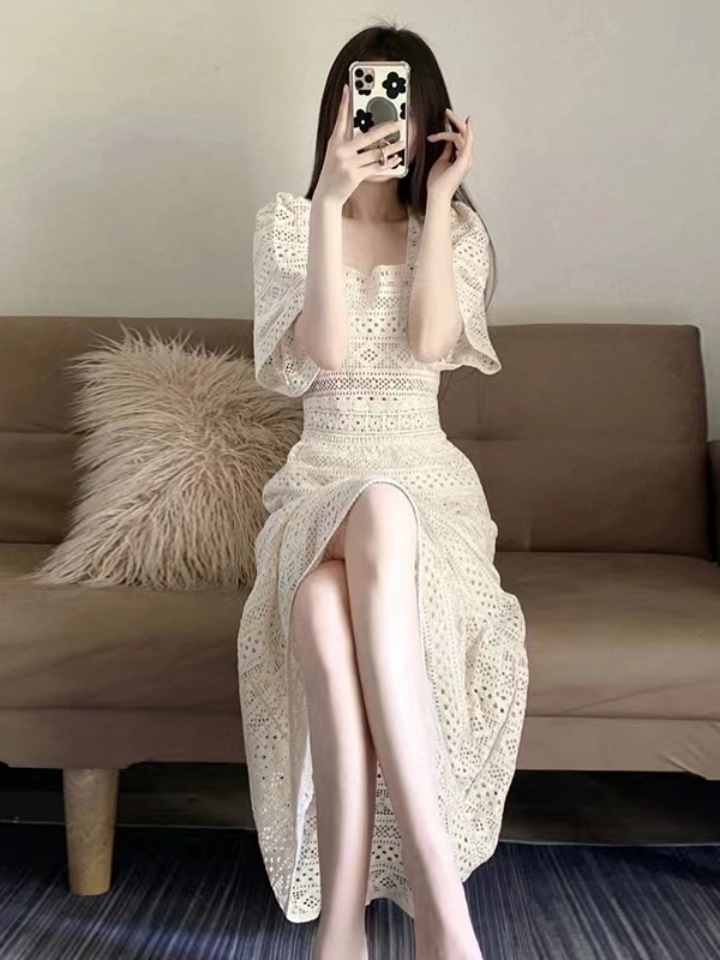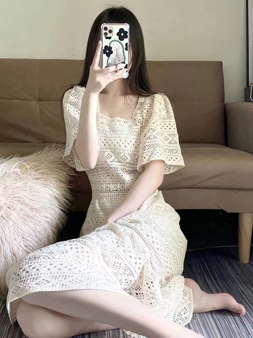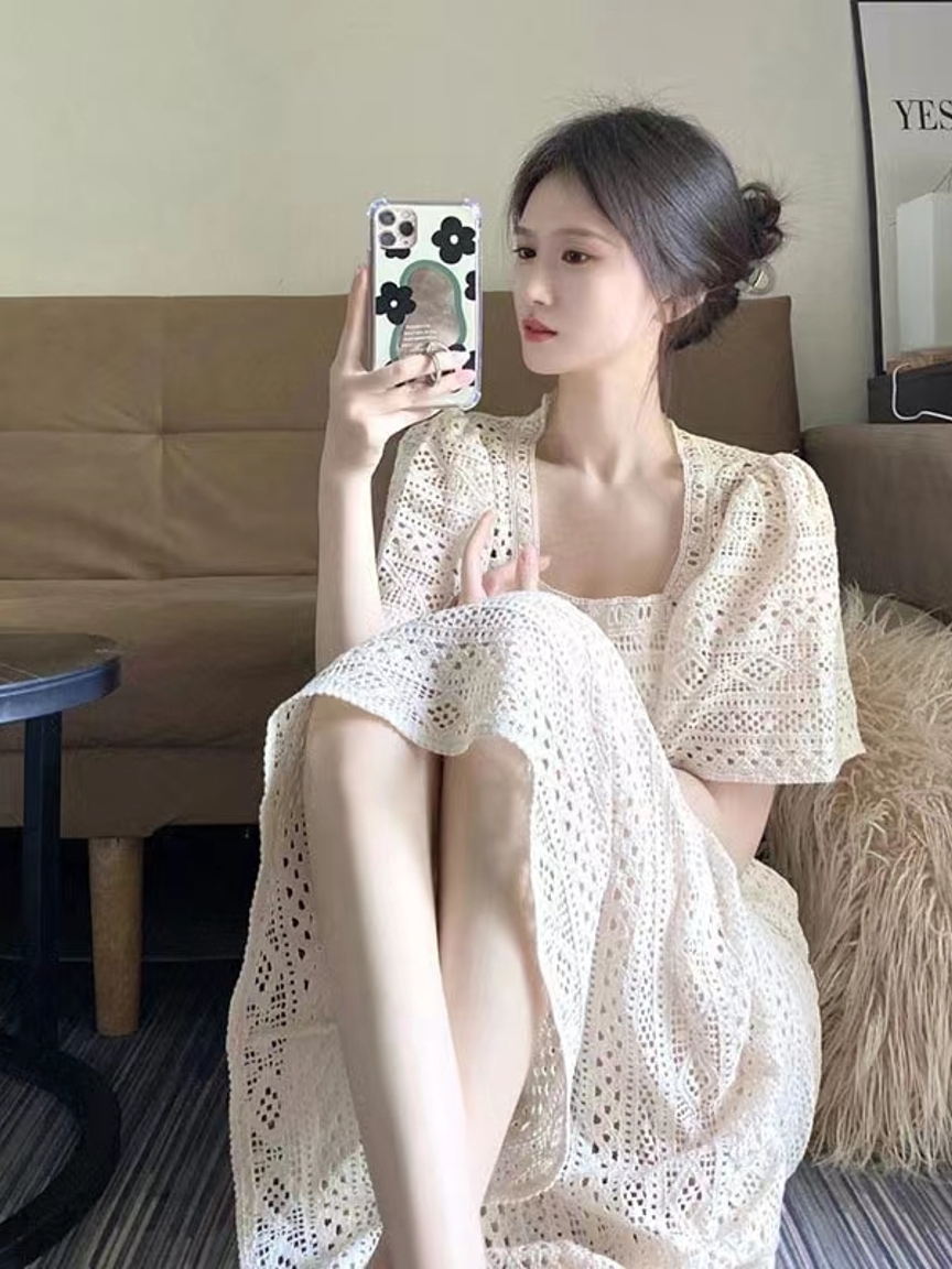 镂空的连衣裙,设计感十足,又能若隐若现露肤,显得很是性感撩人,米白色的颜色,穿起来温柔又大方。