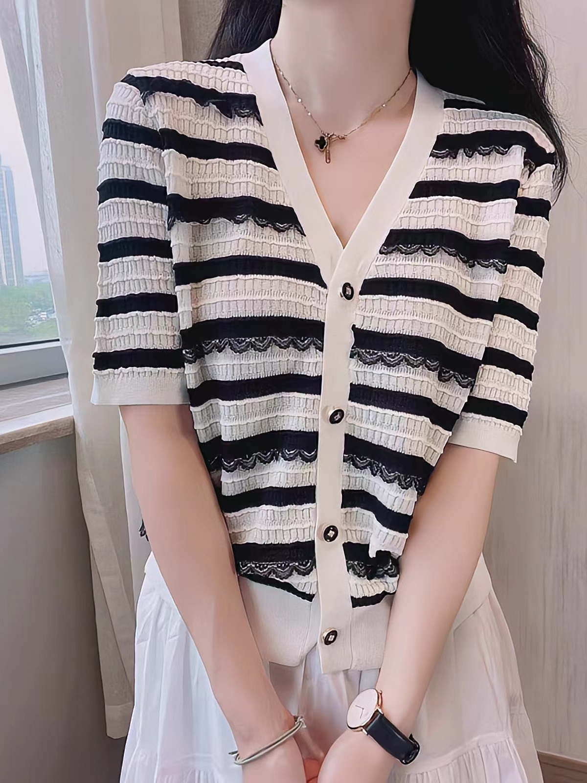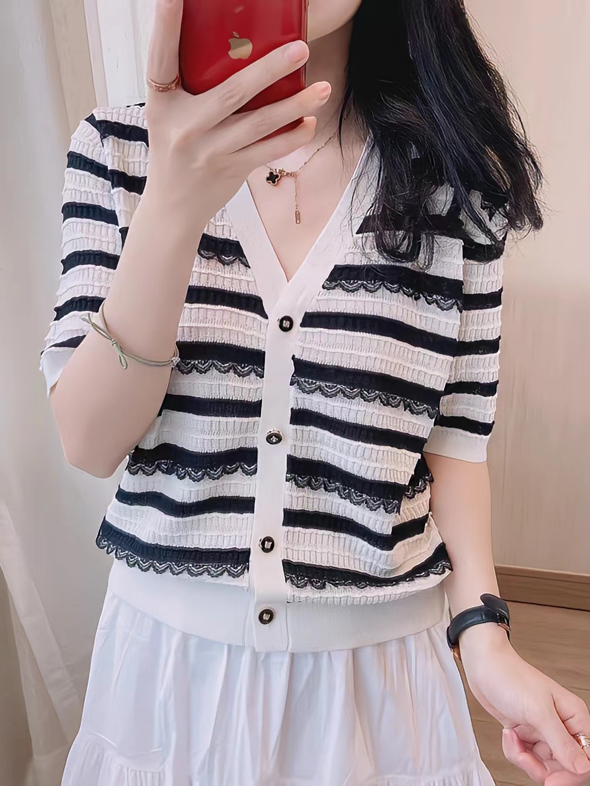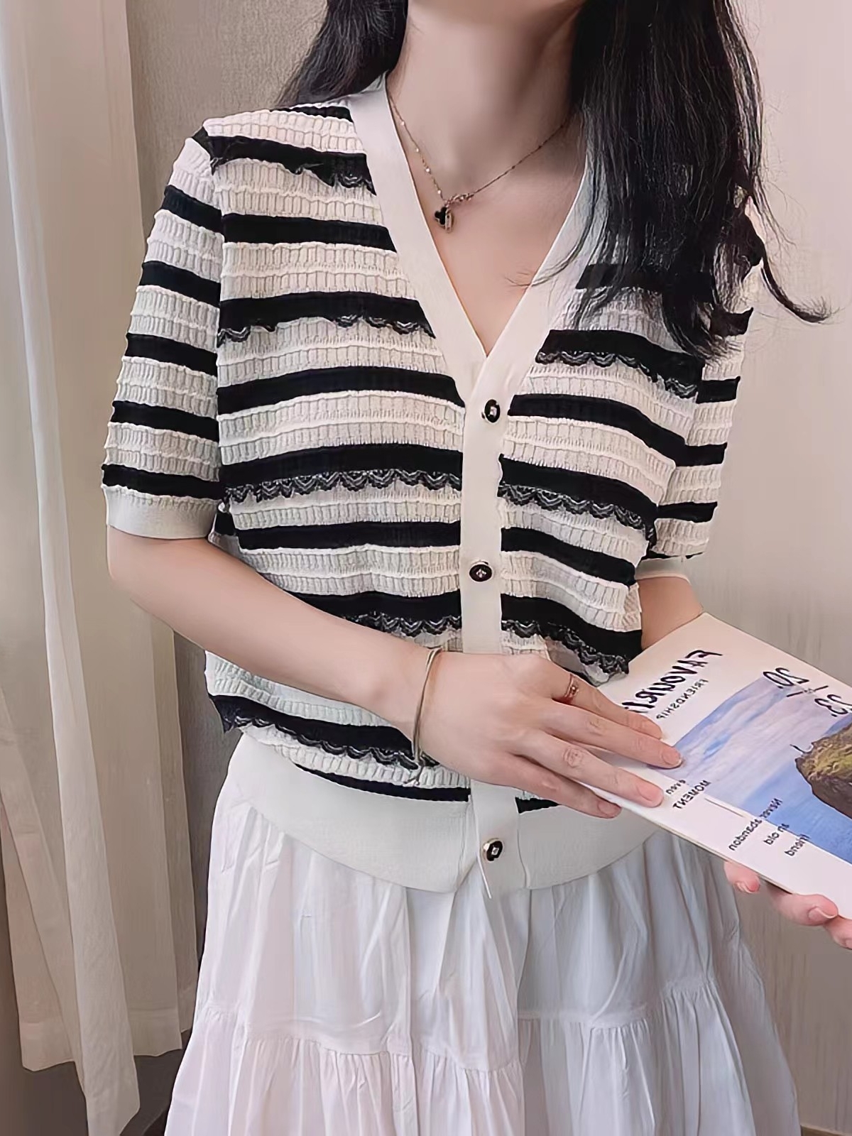经典洋气的V字领,起到了修饰脸型的效果,还凸显出了优美的天鹅颈,采用黑白条纹拼接,多久都不易过时。