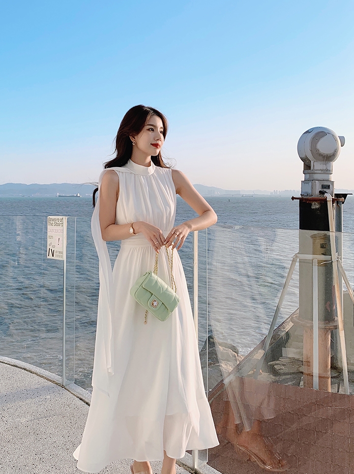 一袭美丽长裙,穿出希腊风情。长长的裙摆适合搭配平底鞋,很有淡雅的气质,走在路上回头率满满。手拎链条小包,名媛气质加分。