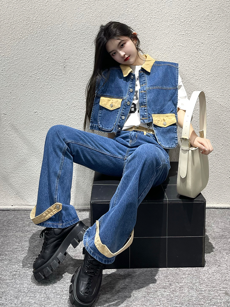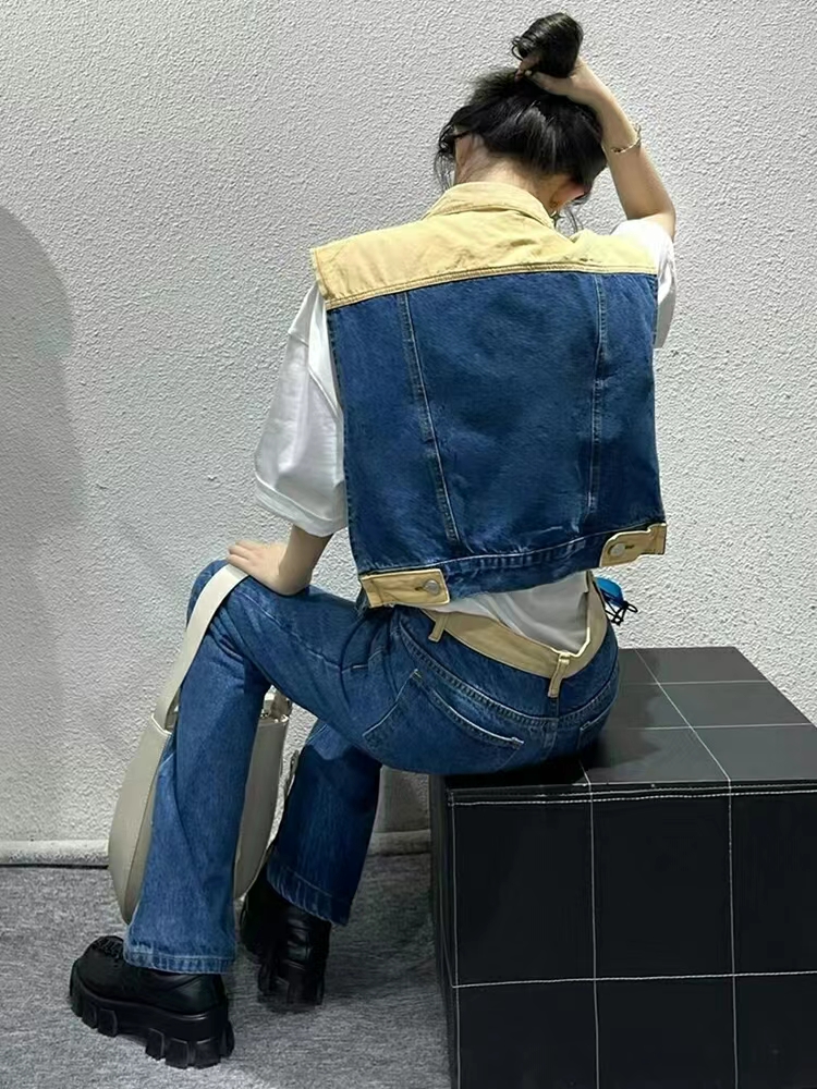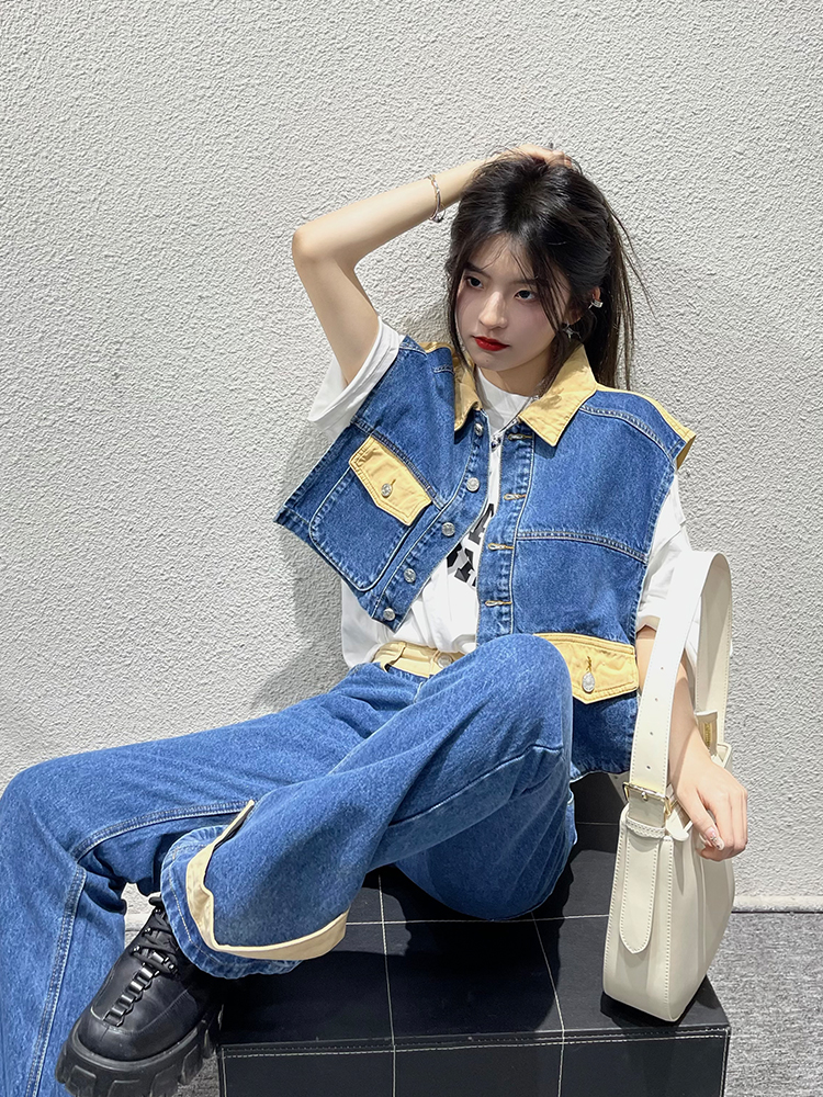 牛仔的马甲做了撞色拼接的色泽,色彩艳丽吸睛,为复古的马甲增加了几分活力与俏皮,上身极具青春feel。