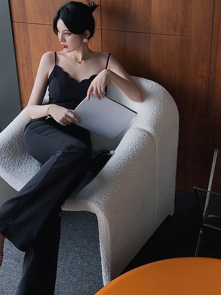 吊带的设计感,穿搭很是性感的,高腰收腰的版型,很显纤细的腰身的,裤子是阔腿裤设计修饰腿部线条。