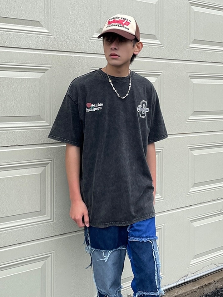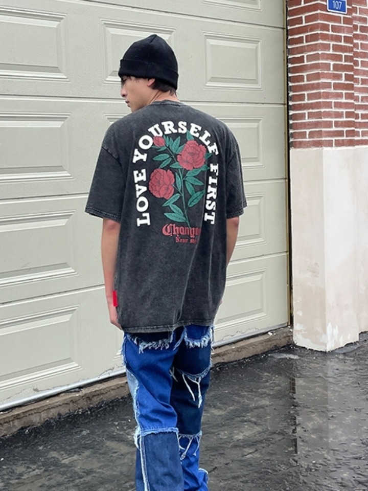 以个性的做旧水洗元素的添加让衣服在视觉上更具时尚潮流气质,外玫瑰的印花增加了一丝趣味性,圆领方便打造不同风格look,随意搭配条牛仔裤尽显潮男魅力。