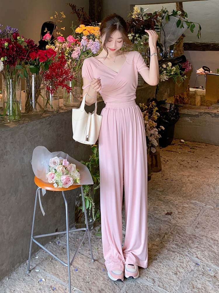 交叉的V领设计,凸显精致的脖颈线条。宽松的阔腿设计,打造休闲风格。松紧腰穿起来没有紧绷感,不挑身材哦。