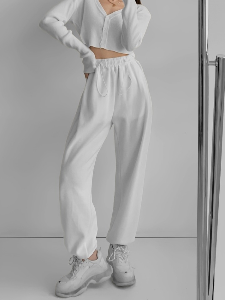 看过这么多休闲运动裤,到底还是比较服气这一条。要说它有多大不同,造型上的区别不大,一样的松紧带裤头,还带有抽绳,包括两侧的口袋,收紧的罗纹裤脚等,