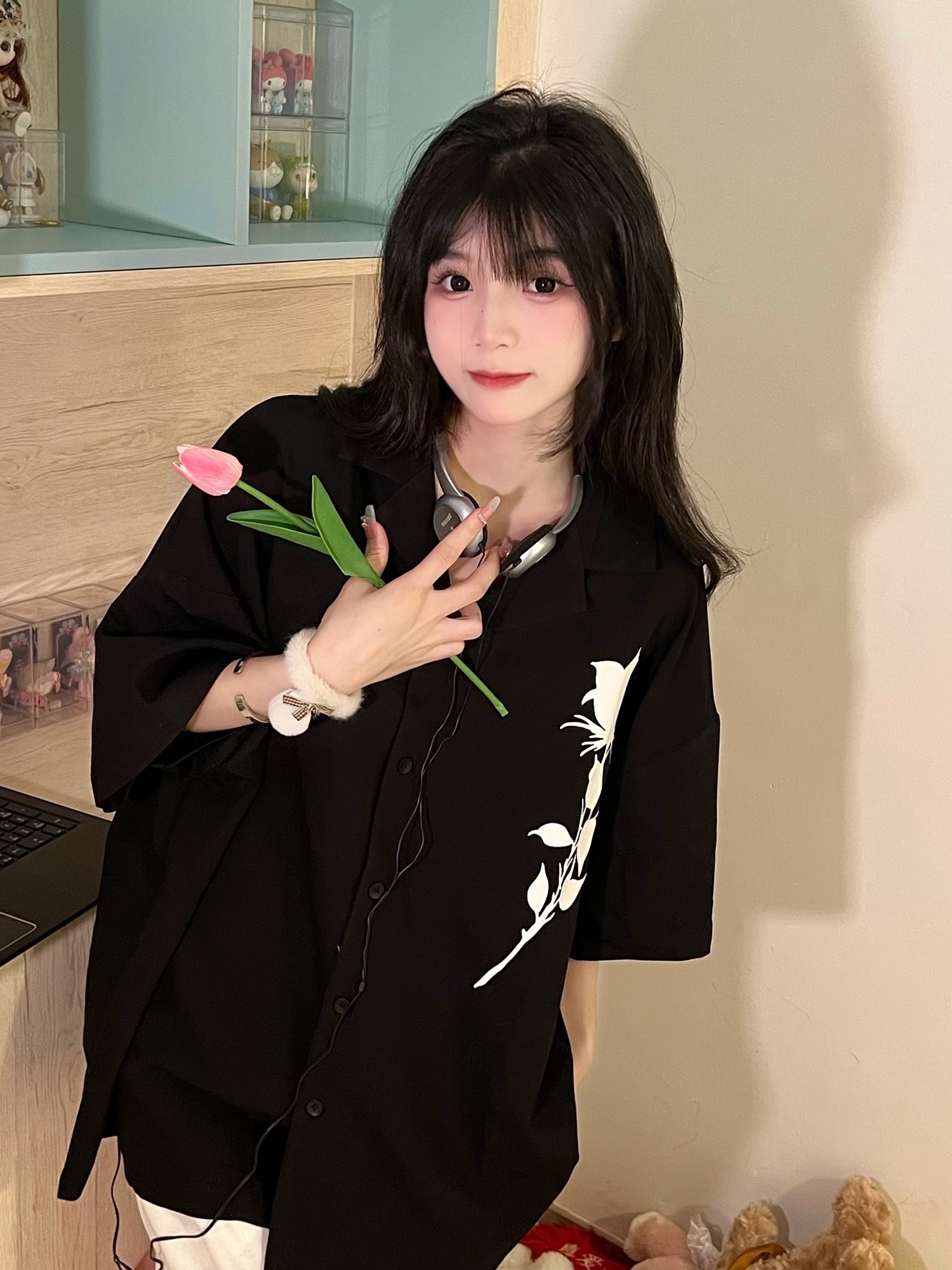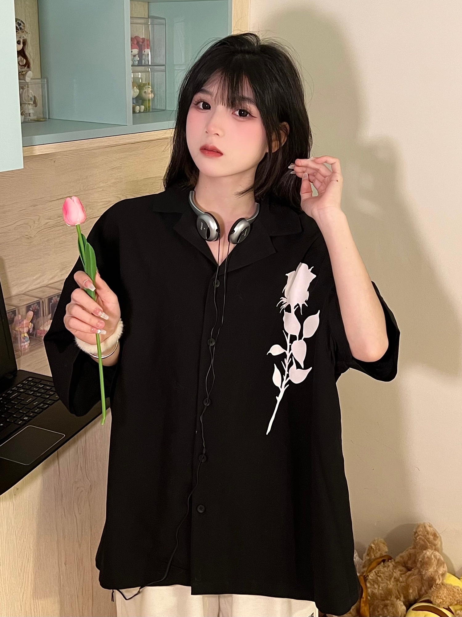 衬衫胸前的玫瑰印花非常个性时尚,宽松的版型对身材没有要求,上身超级遮肉显瘦,我真的特别喜欢。