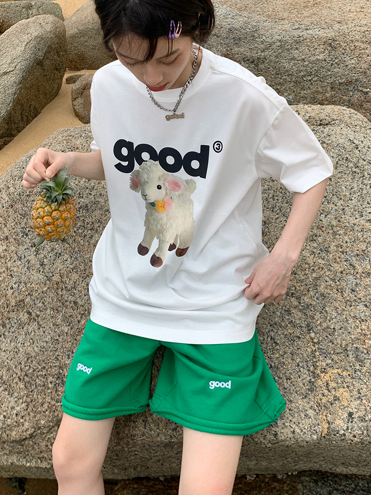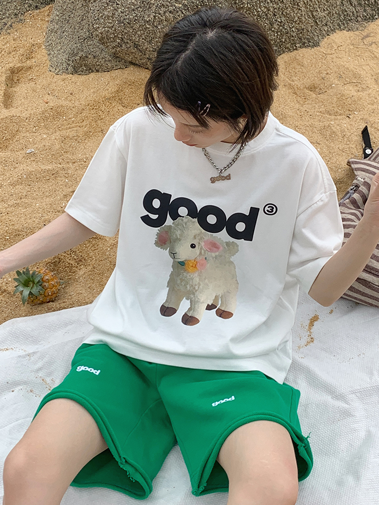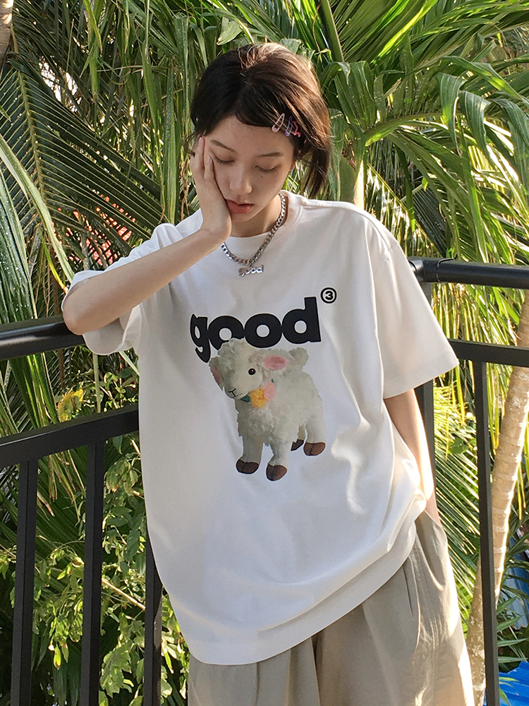 看起来有点男友风的感觉,领口微露锁骨,而且也不易走光,胸前的小羊印花,给单调的T恤调调味,而又带点可爱的气质。