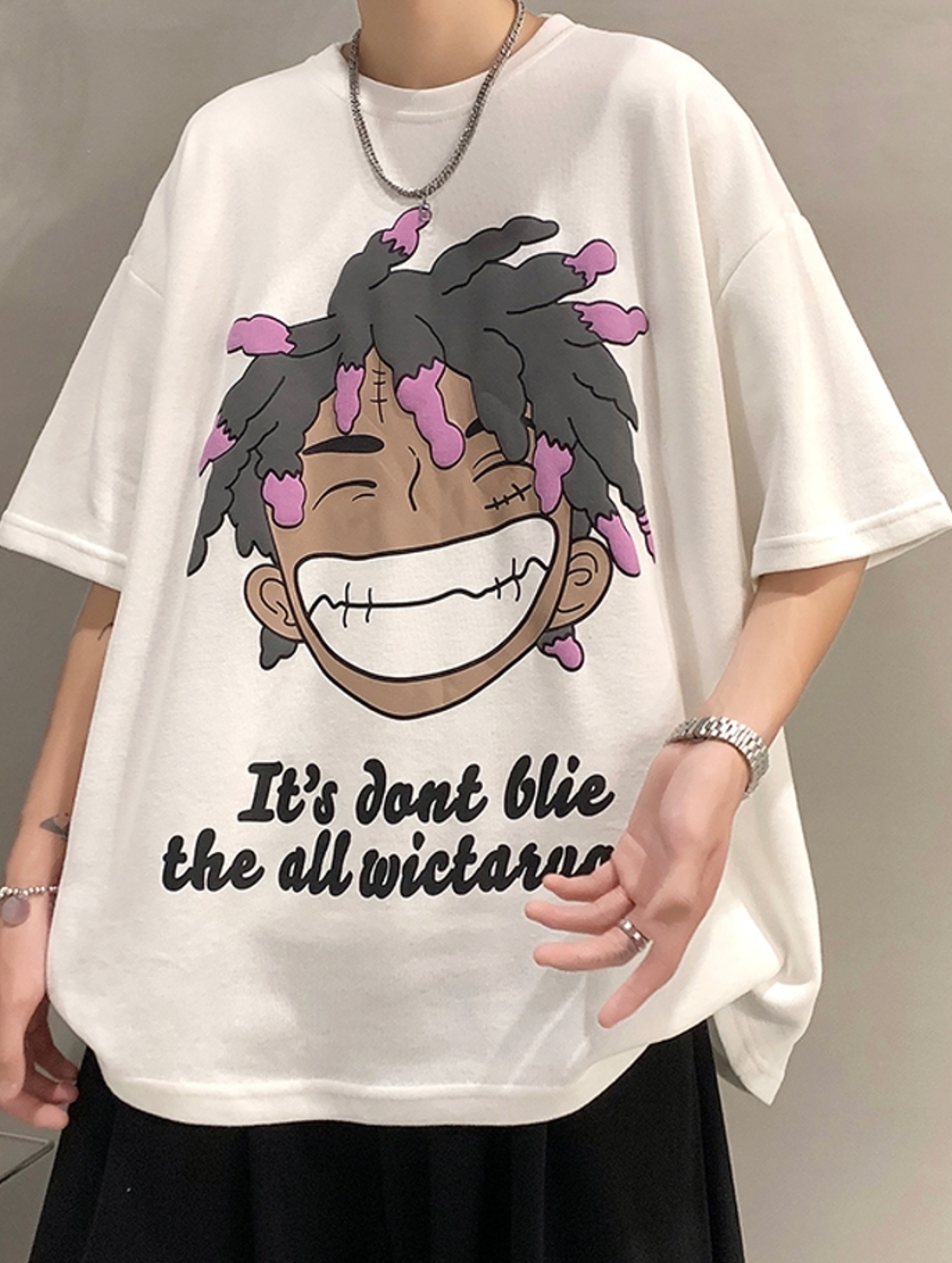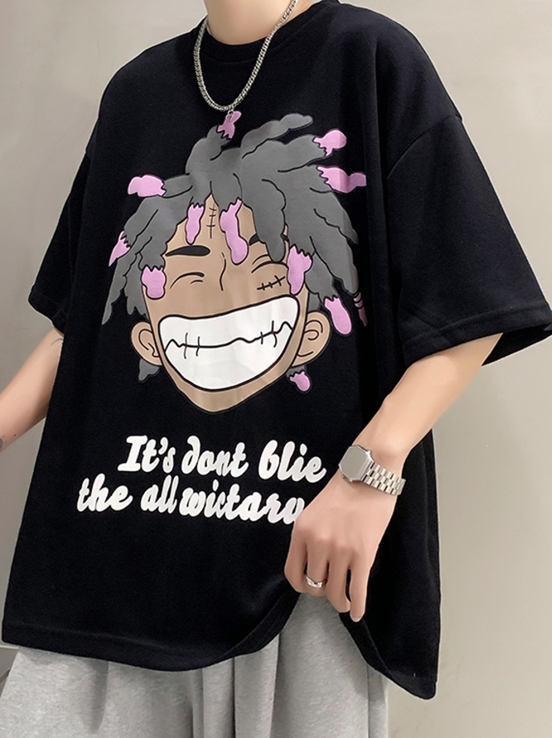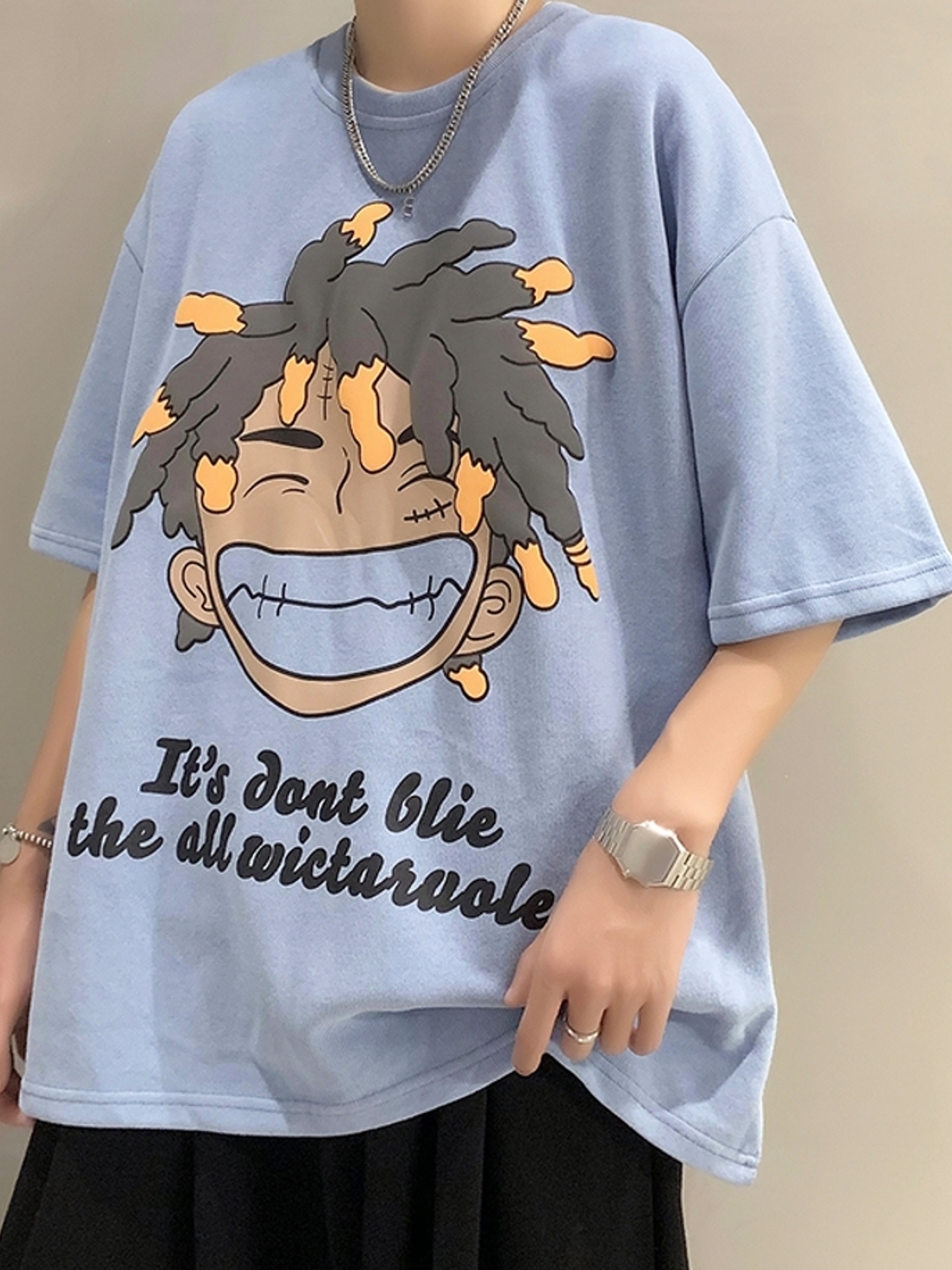 衣服的领型是圆领,衣服的版型是 宽松型,真的特别喜欢,黑色的短袖超级显瘦,面料很舒服,搭配简单的牛仔裤都很好看,衣服上有很大的卡通图案,很潮流