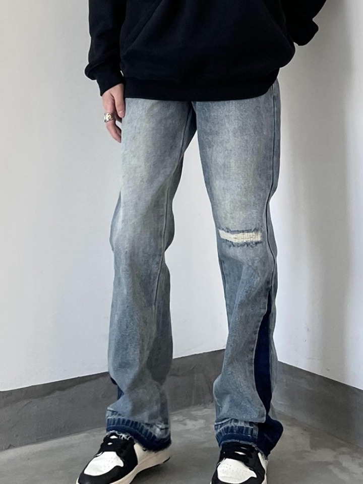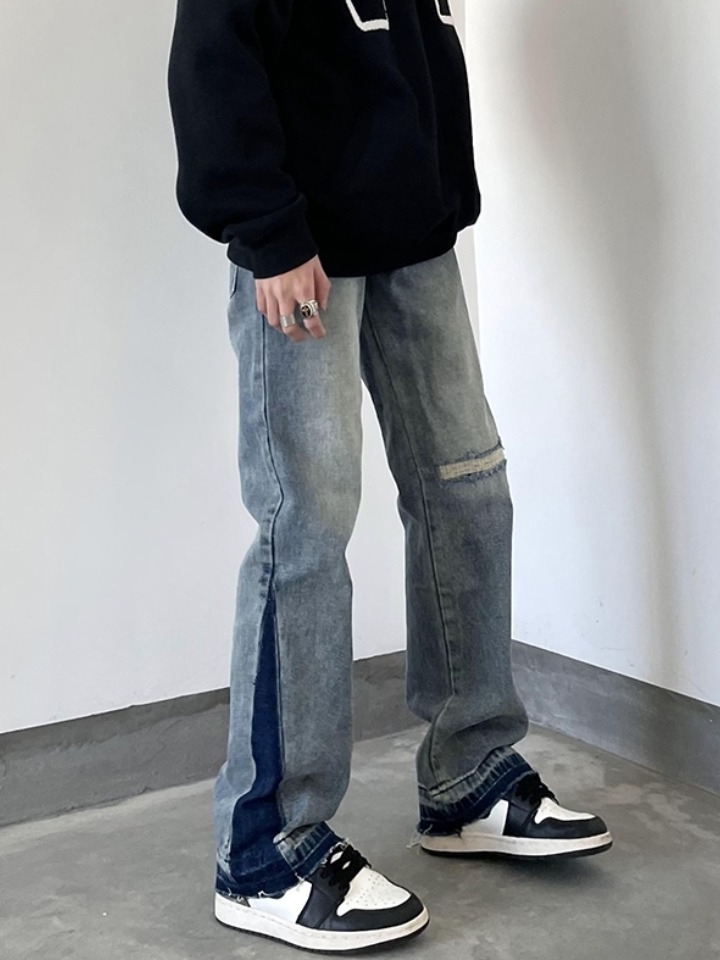 作为时尚界的宠儿,破洞和口袋装饰的小喇叭牛仔裤,结合了破洞和微喇裤型两大流行元素的时尚潮流丹宁单品。