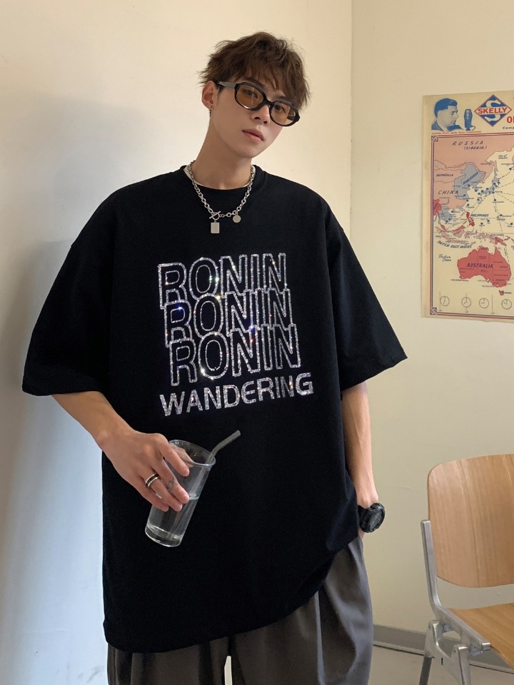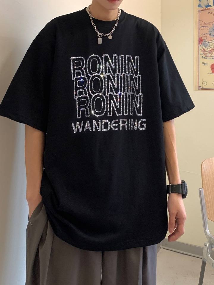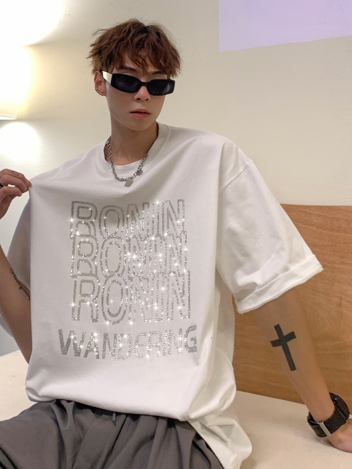 经典圆领,独特的烫钻字母印花,欧美简约时尚个性修身休闲短袖T恤,细致剪裁,车线细密,加之流畅的剪裁,双车线缝制,突显都市男性的简约风格,清爽利落。