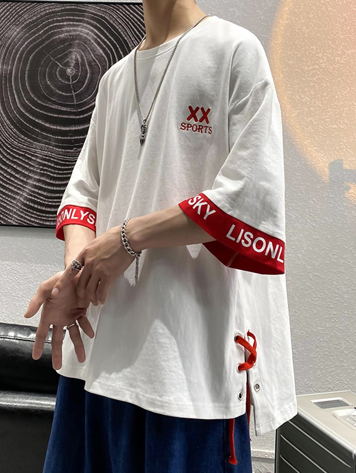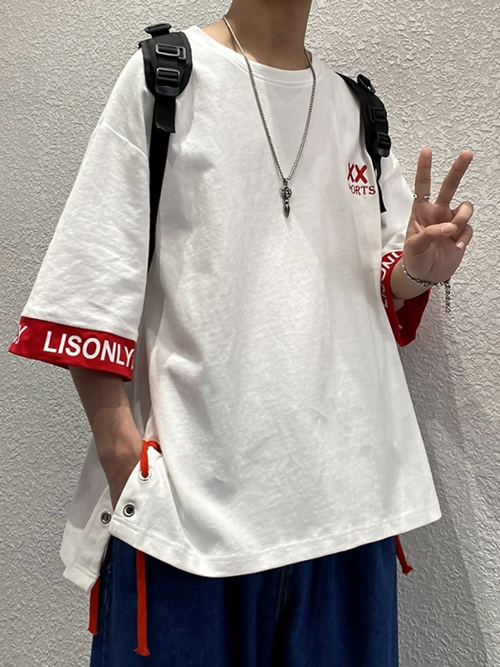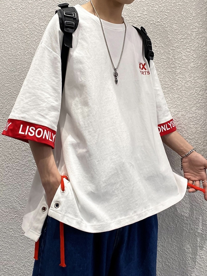 宽宽大大的OVERSIZE版型短袖T恤,春夏必备的款式。袖口撞色宽条字母拼接装饰,打破了单调性凸显层次感。