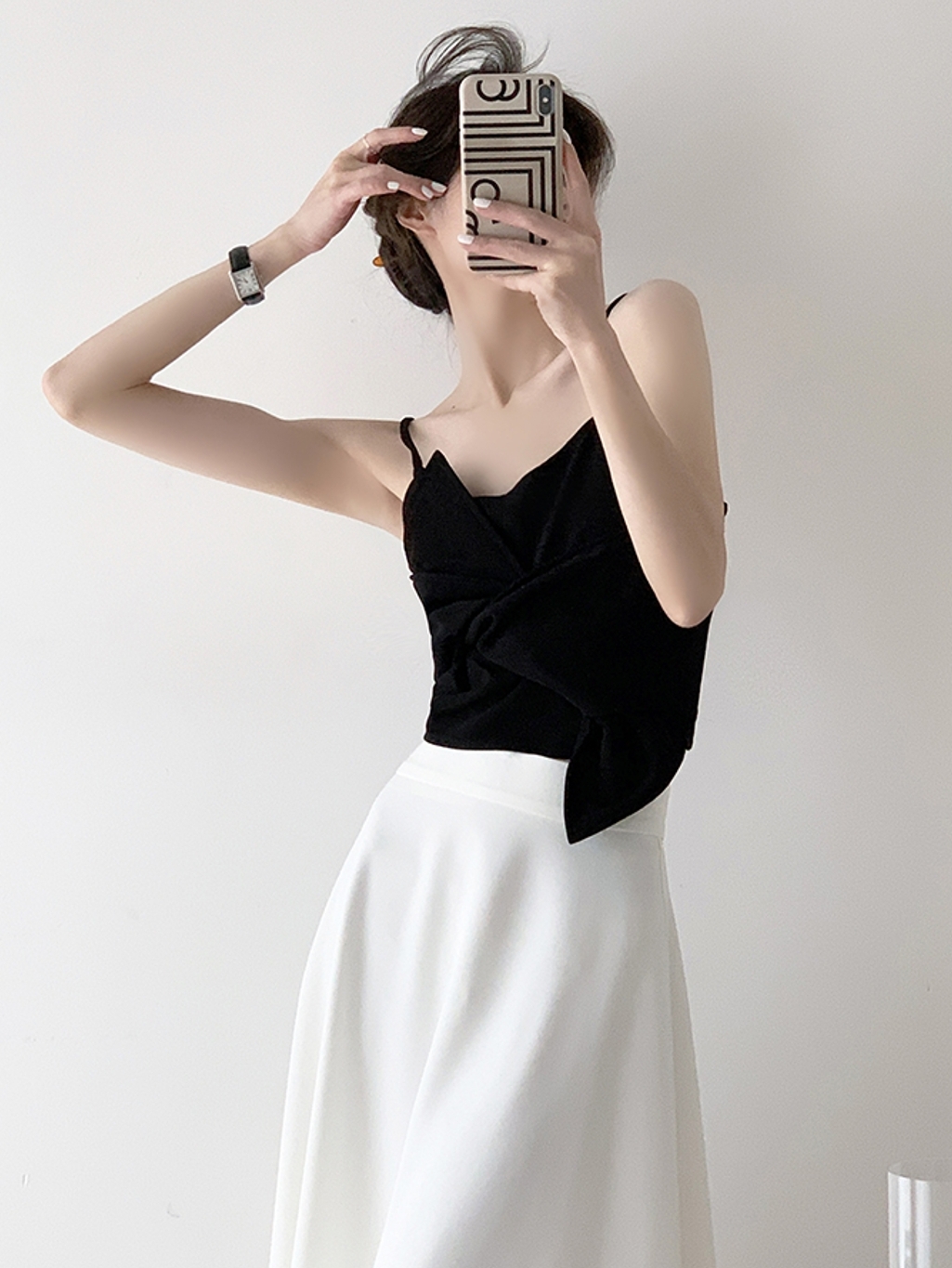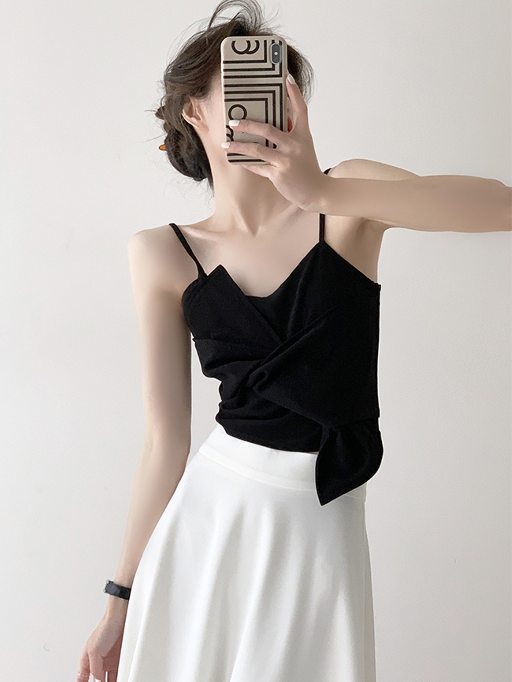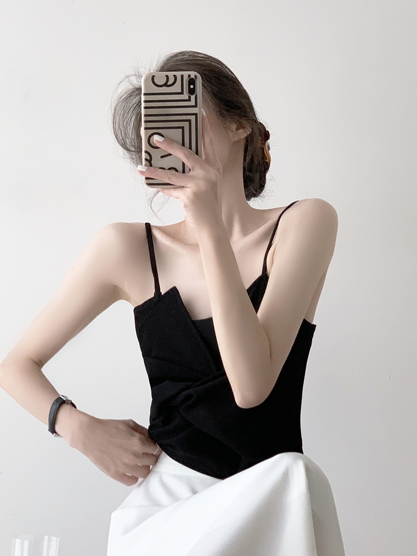 前卫且时髦的小背心,采用了吊带背心的款式,露出女性颈部与美背,迷人而又增添小性感。纯黑色调的应用,视觉上非常显瘦,十分有设计感。领口前后的v型设计,让你轻松穿出洋气的感觉。修身的版型设计,凸显出窈窕迷人的腰身曲线,纤细而又曼妙。