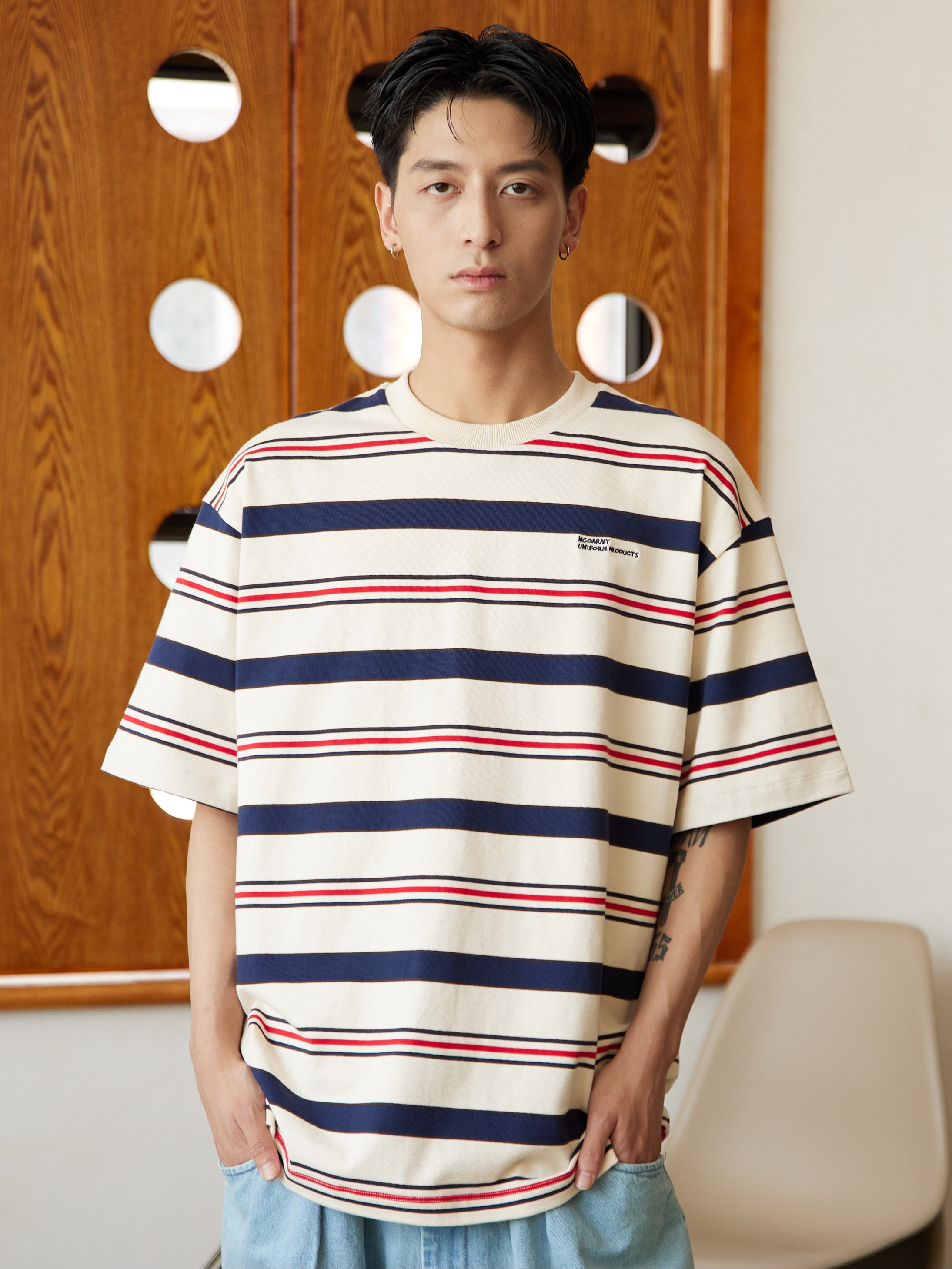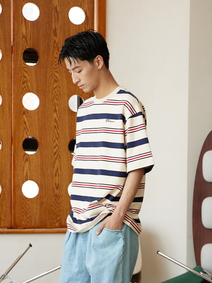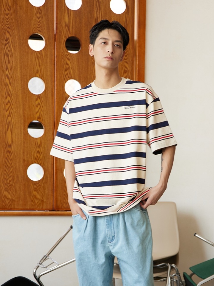 我这款是很基础款的条纹T恤呢,采用了经典的条纹元素,撞色的设计让视觉效果更加突出。上身就是简单又帅气的感觉啊。