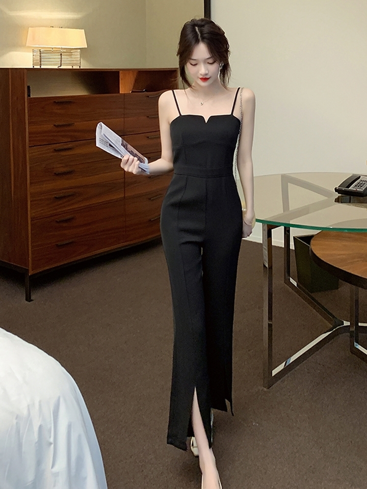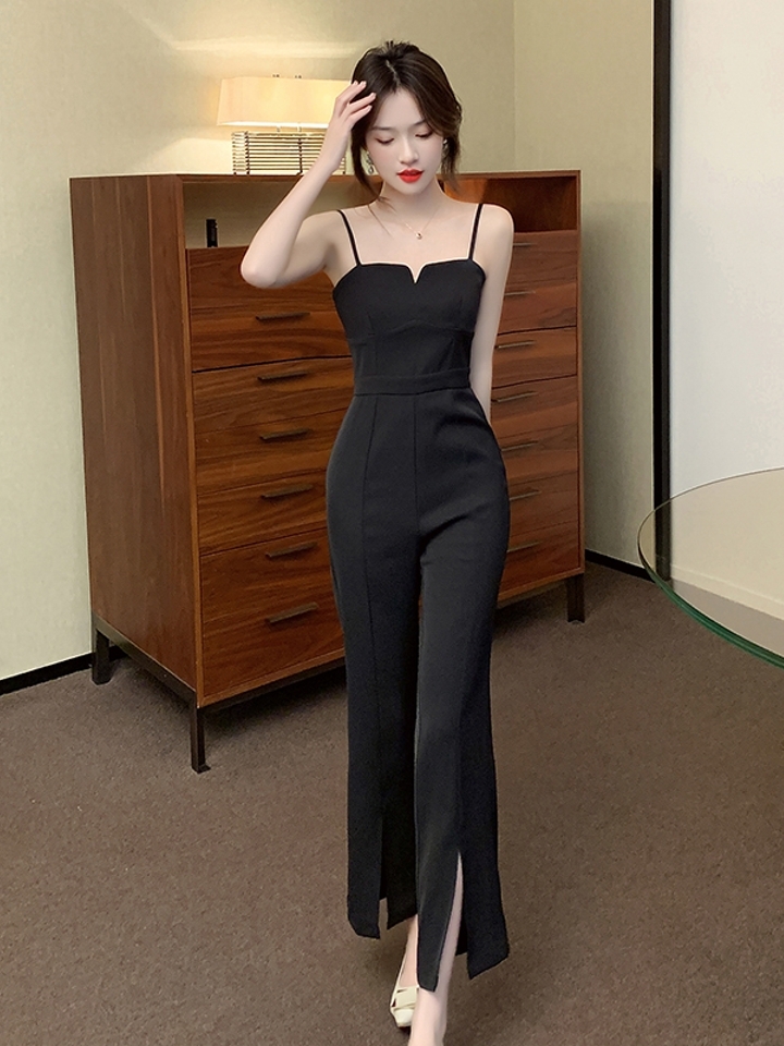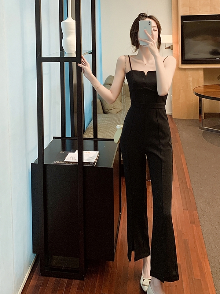 这款高级感吊带开叉阔腿连体裤,我很喜欢这个高腰设计,感觉腿都长了,还显瘦;上面还可以随便套个小衫都好看。