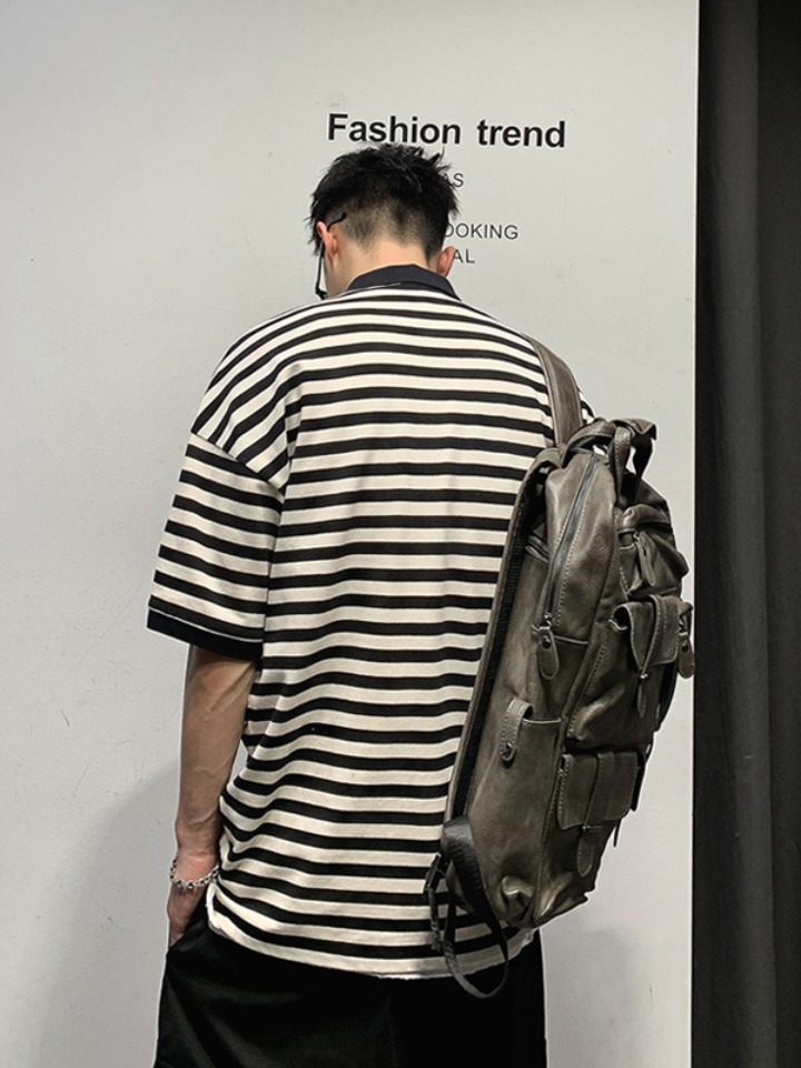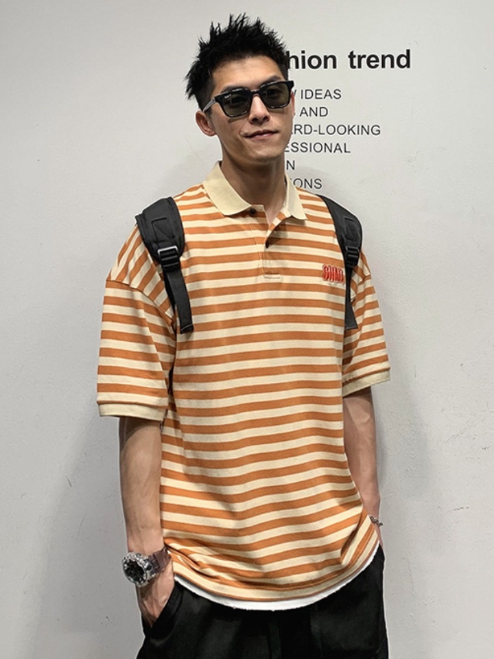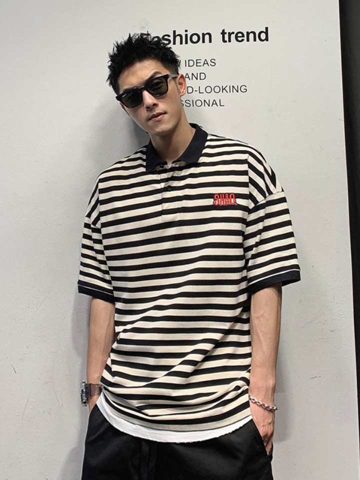 polo衫条纹款不多见,看上去很有气质,条纹元素本来就显得很清新自然,搭配浅色的牛仔裤就很不错,或者五分短裤也可以。