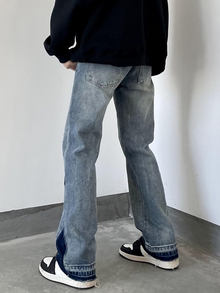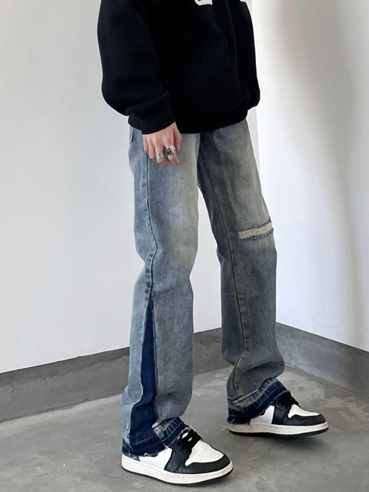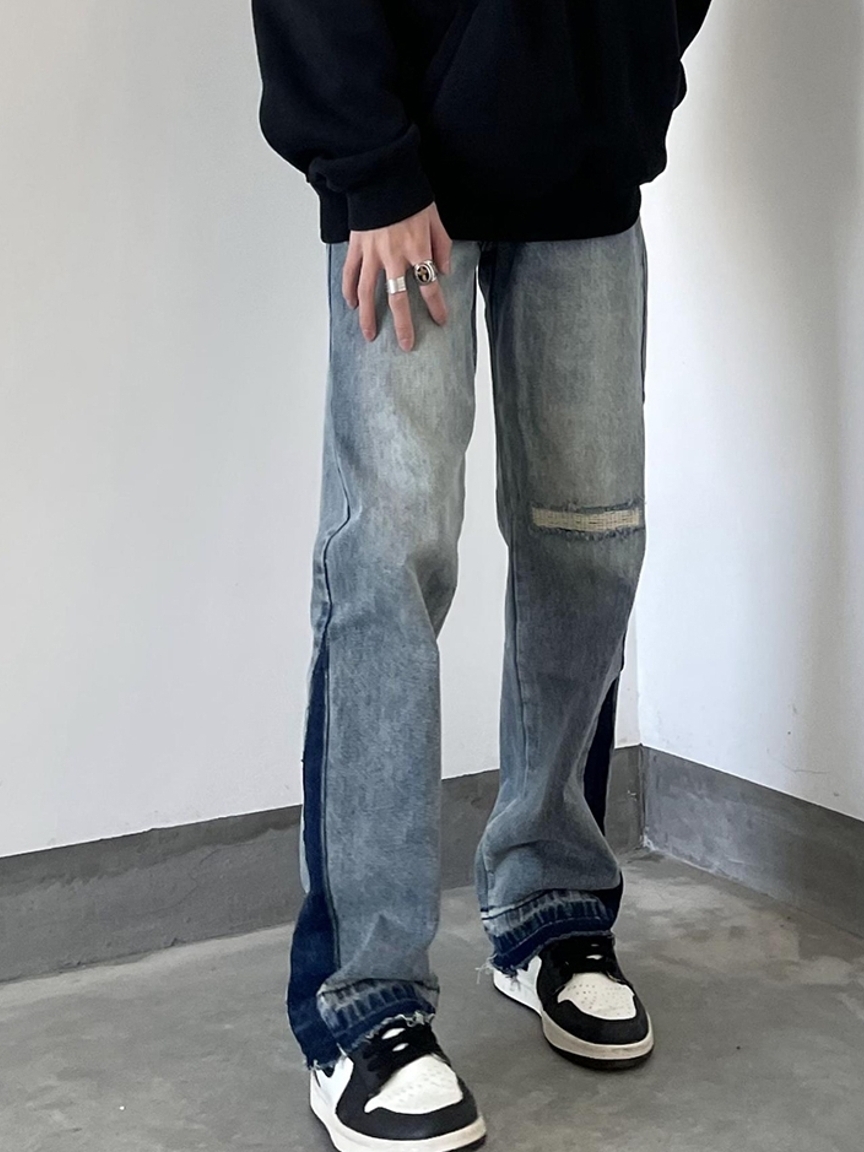 直筒的设计很显腿长修饰腿型,看起来清爽简单而又不失轻松,在裤子上做的破洞更具有不羁和帅气风格!